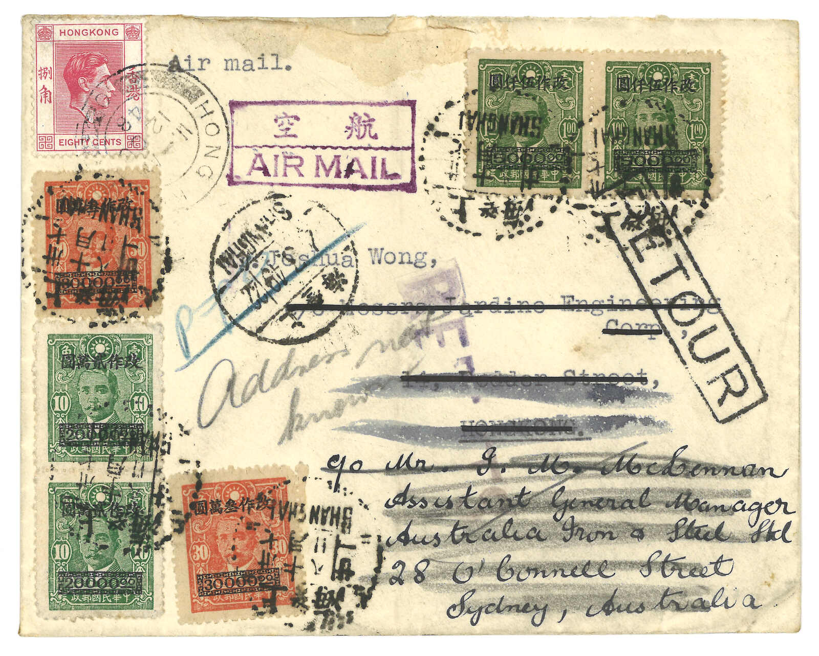 1948 (8 Oct) UK Trade Mission to China cover from Shanghai to Hong Kong, redirected to Australia and returned to Hong Kong, f.w. SYS surch $5000 in pair + $20000 in pair + surch $30000 x2, in total of $110,000 international