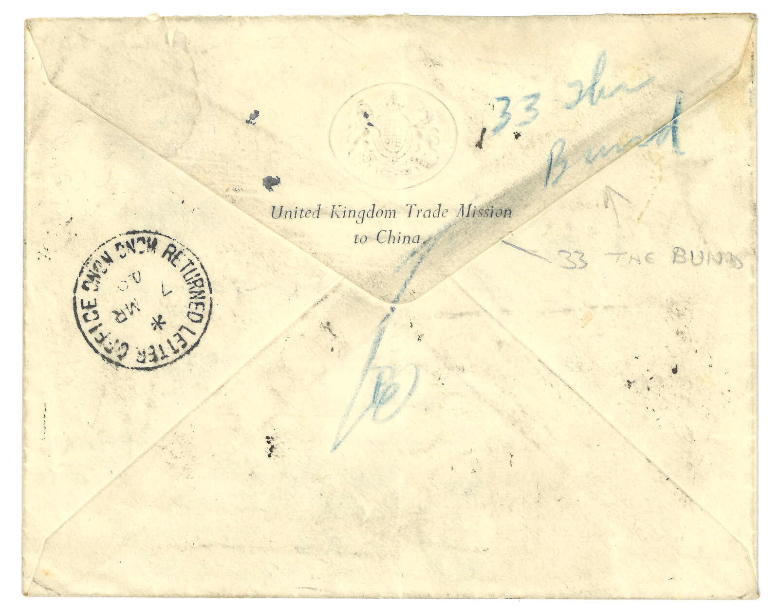 airmail rate, tied by Shanghai bilingual cds. Arrived Hong Kong and f.w. KGVI 80c for refirection to Australia but refurned to Hong Kong Returned Letter Office (7 Mar). Interesting.