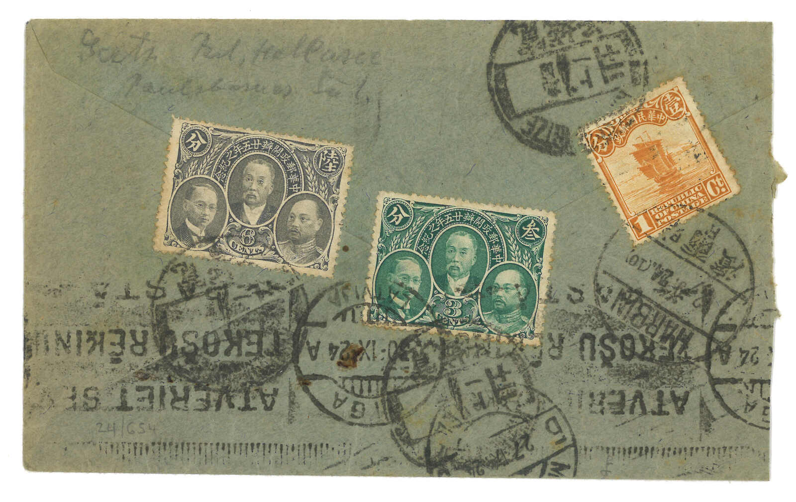 1924 Kwanchengtze (11 Sep) to Riga, f.w. 25th Anniv of Postal Service 3c + 6c + Junk 1c on reverse, tied by Kwanchengtze bilingual cds. Transit Harbin (12 Sep). Arrived Riga (30 Sep).