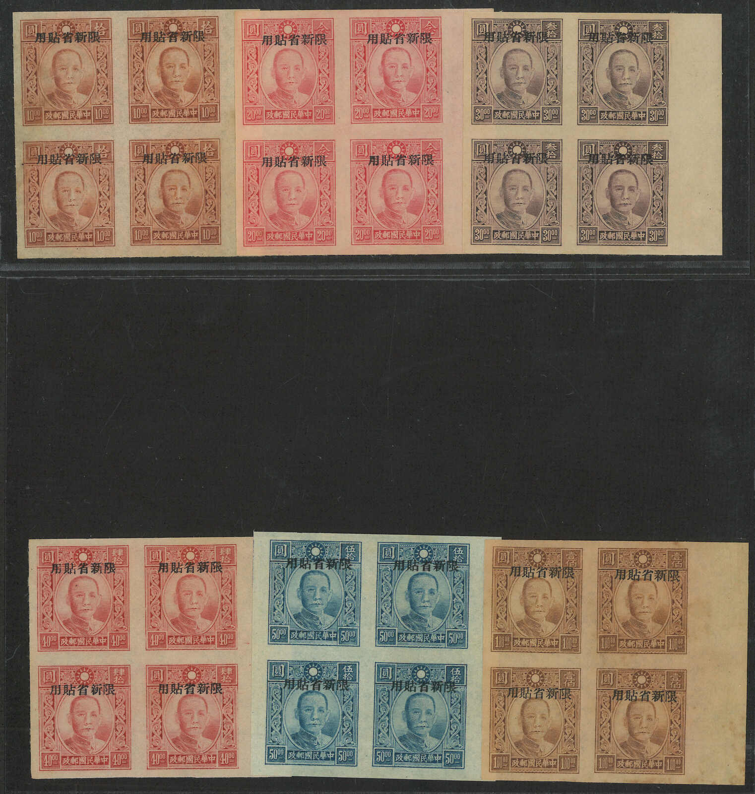 1942 Paicheng Print SYS ovpt. Limited For Use in Sinkiang imperf complete set in block of 4 (Chan PS228-233), MNH without gum as issued.