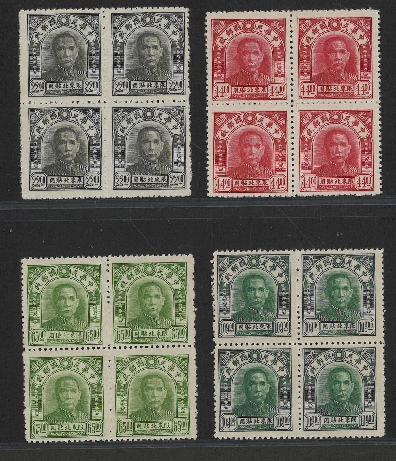 1947年北平中央二版孫像限東北貼用22元、44元、65元及109元四方連新(陳目NE56、57、59、61),無貼上品。(Image 1)