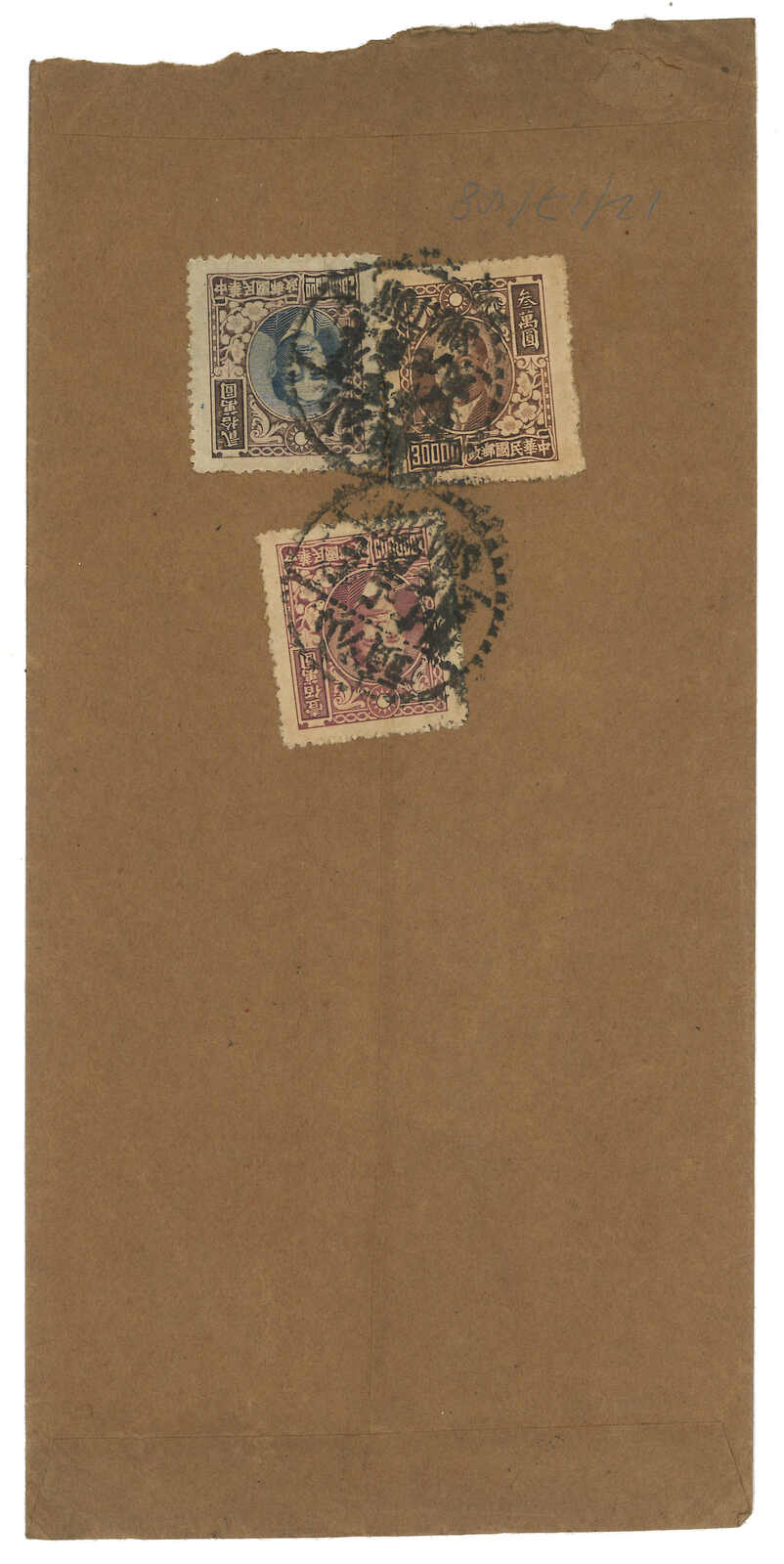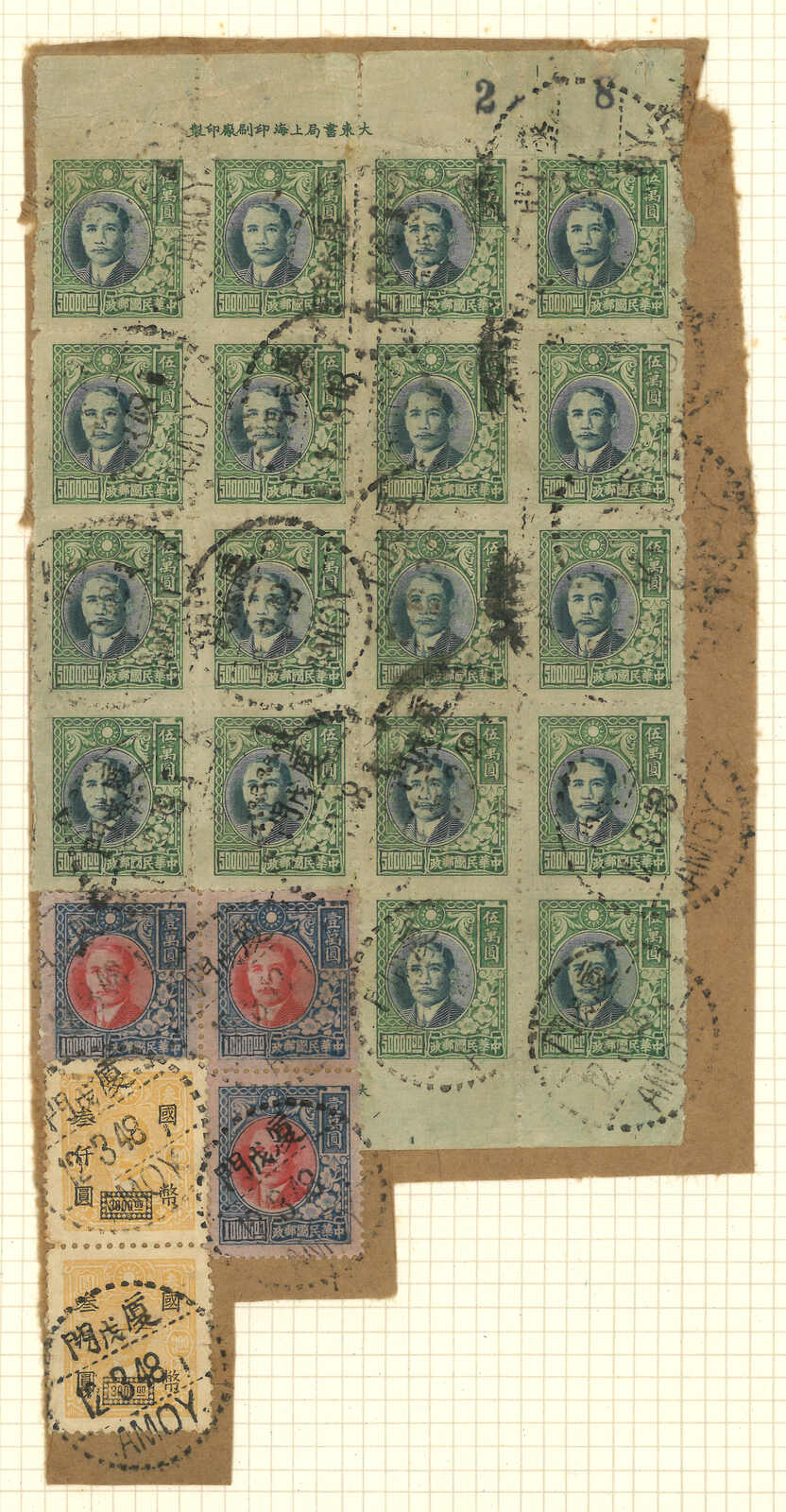 1948 a group of 3 cover pieces from Fukkien, probably Huipi (receipt of remittance) bulk mail, all with large franking of SYS issues, tied by Amoy or Yungchung bilingual cds. Example of hyperinflation.