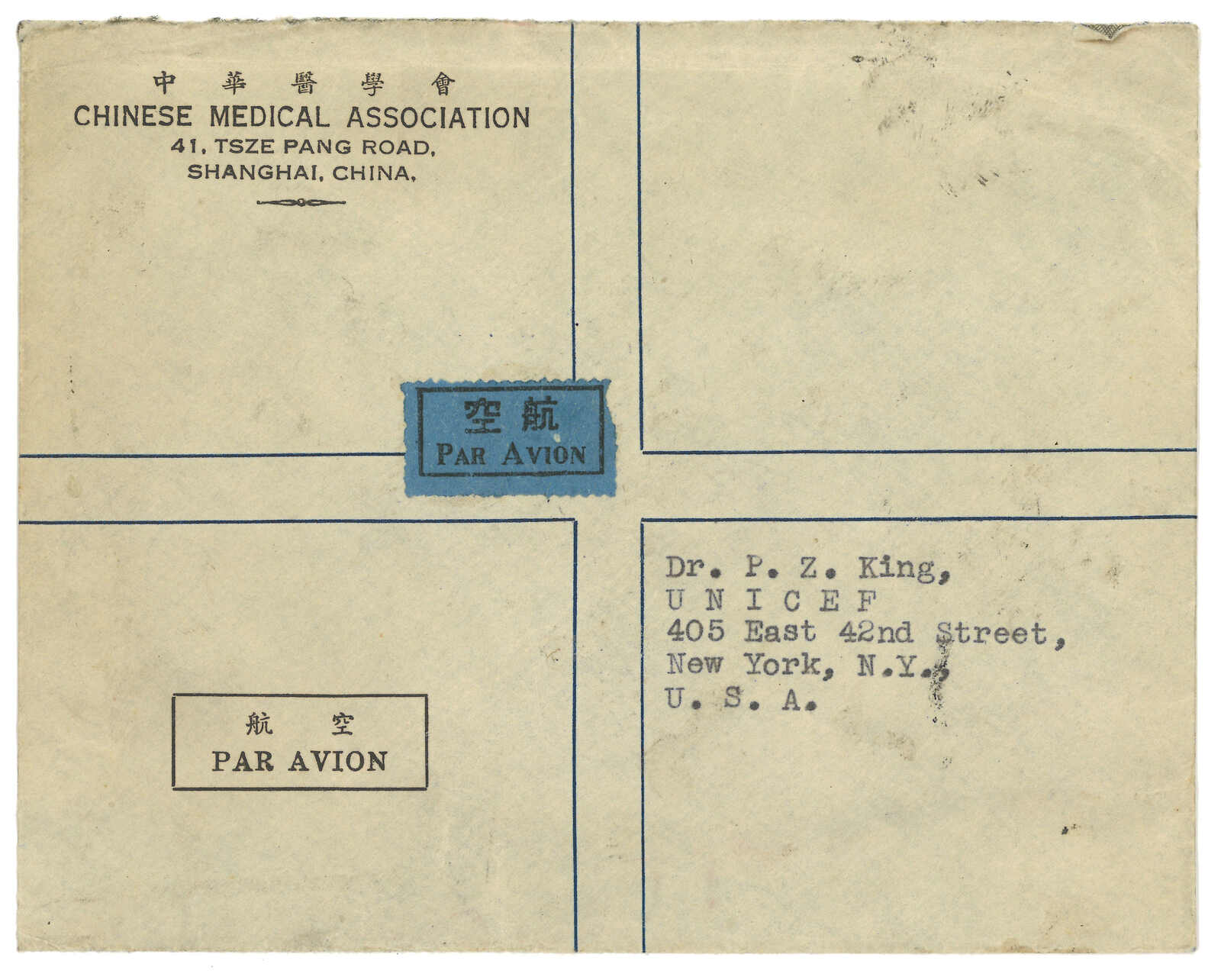 1949.5.19 上海寄美國。航空封,背貼孫像金圓10萬元十六方連,即銀圓4角,銷上海三格漢英點線日戳。日期為上海航線中斷前夕。(Image 1)