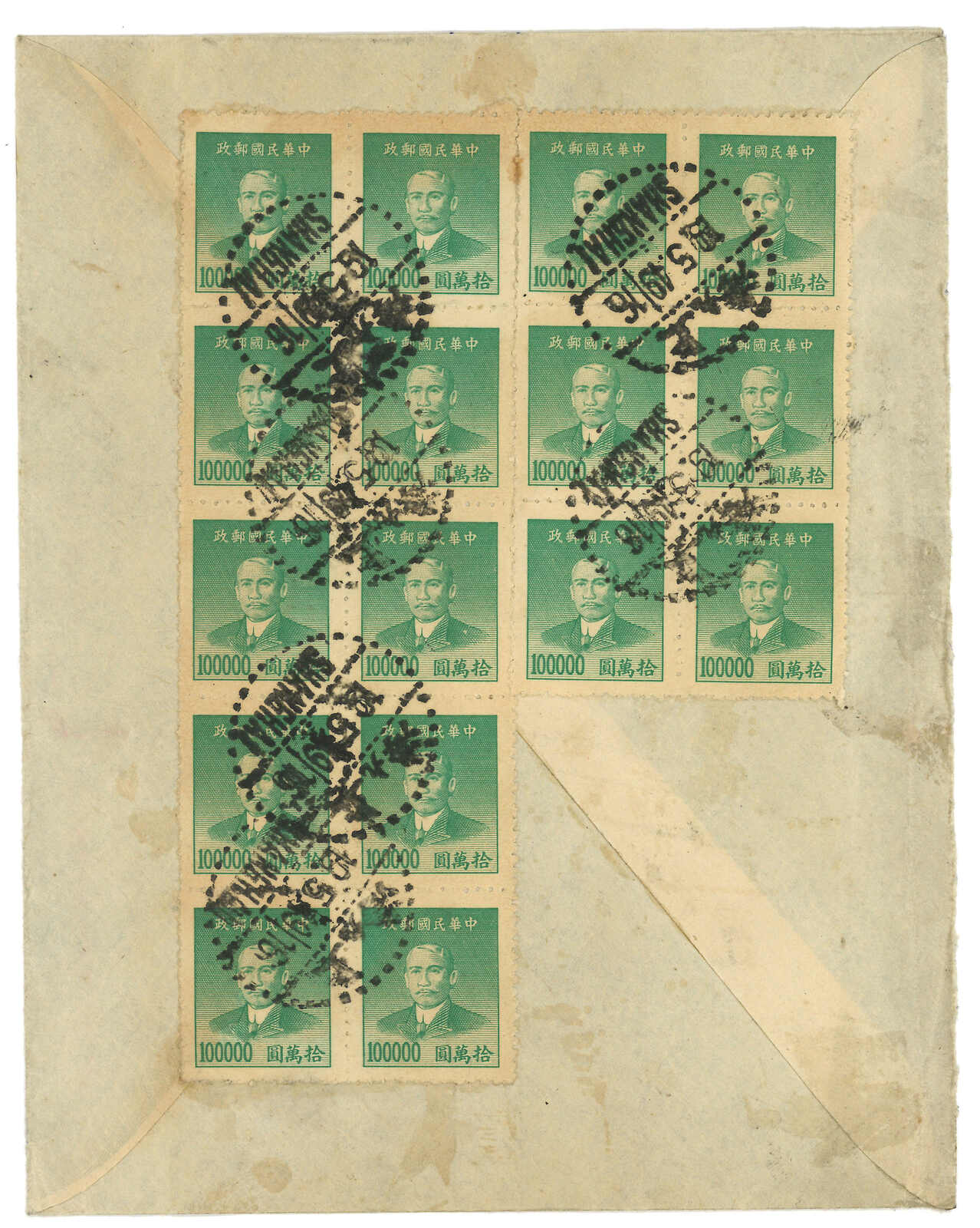1949 Shanghai (19 May) to USA. Airmail cover, f.w. SYS Gold Yuan $100000 in block of 16 on reverse, in total of Silver Yuan 40c, tied by Shanghai bilingual cds. Dated just before the interruption of Shanghai flight route.
