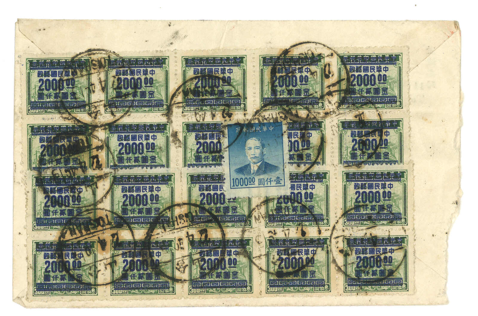 1949.4.22 台山寄美國,背貼印花稅票改值金圓2000元二十方連 +孫像金圓1000元,合國外航空郵資4萬1千元,銷台山三格漢英日戳。封左側打開。該郵資僅於4月17至4月28日生效。(Image