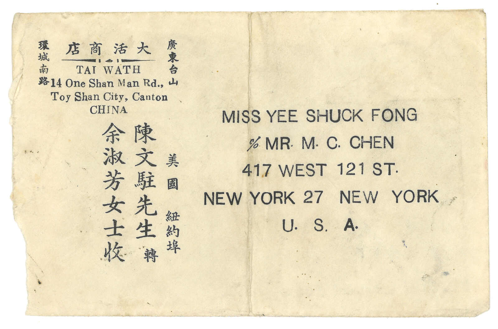 1949 Toishan (22 Apr) to USA, f.w. Revenue stamp surch Gold Yuan $2000 in block of 20 + SYS Gold Yuan $1000, in total of $41000 international airmail rate, tied by Toishan bilingual cds. Cover roughly opened at left. This rate