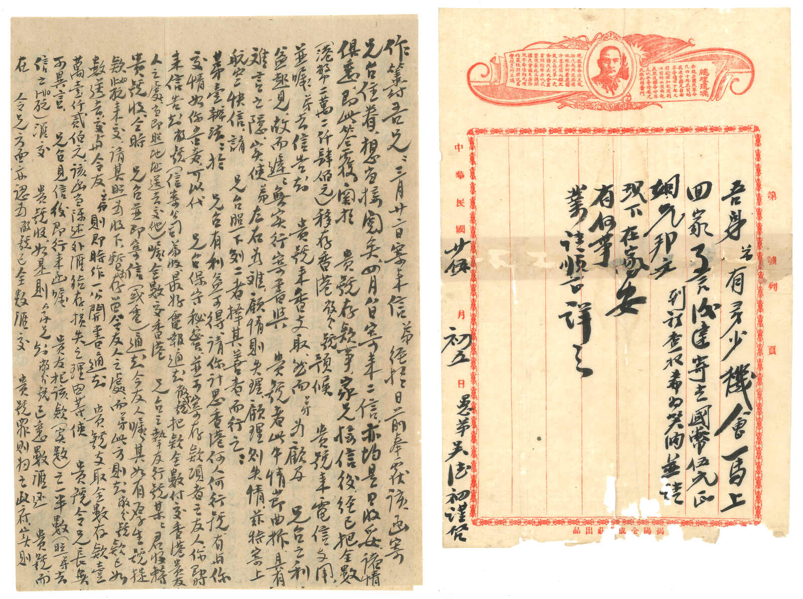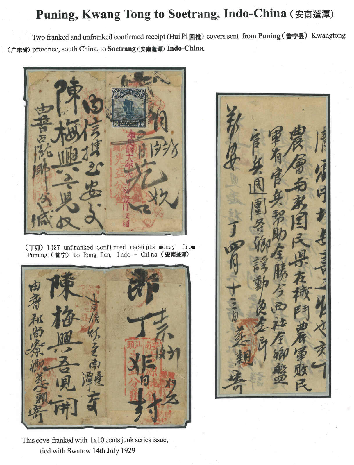 1927-1929 a pair of Huipi (receipt of remittance) from Puning to Soetrang, Indochina. One f.w. Junk 10c while another one frankless, both applied with “Swatow Kwangyi Dispatch / Annam Kiyuan remittance” vertical seal. Similar
