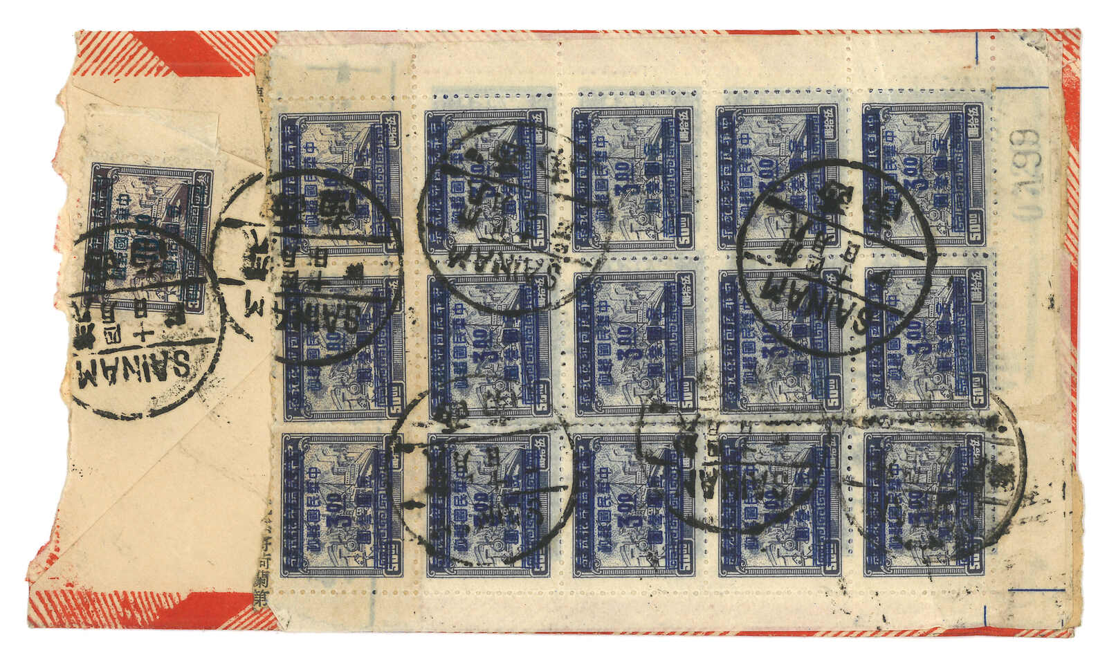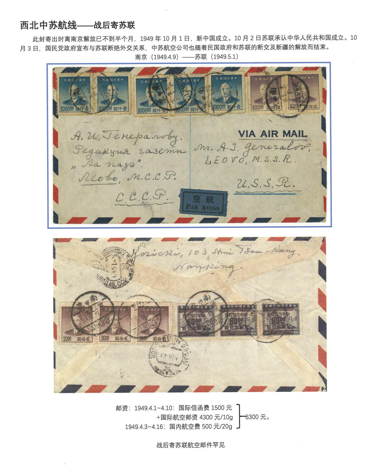 1949.4.9 南京寄蘇聯。航空封,正背貼孫像金圓 + 印花稅票改值金圓共13枚,合6300元,銷南京三格漢英日戳。5.1抵蘇聯。由於民國-蘇聯關係惡化,二戰後寄蘇聯封甚少,空郵更罕。此封寄於新中國成立僅數月前。(Image 1)