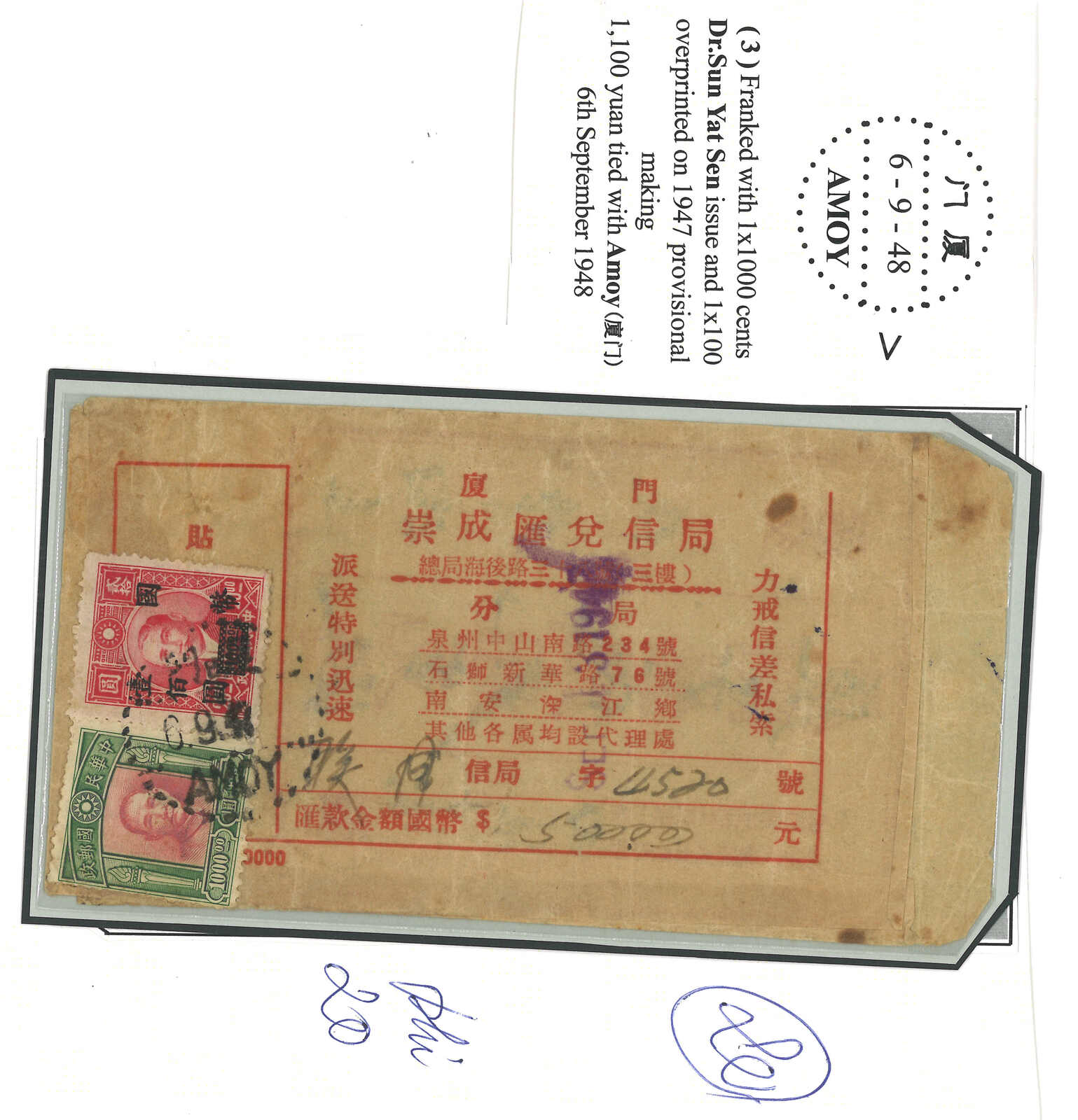 1947 (6 Sep) Huipi (receipt of remittance) from Amoy, f.w. SYS $1000 + surch CNC $100 for international letter rate, tied by Amoy bilingual cds.