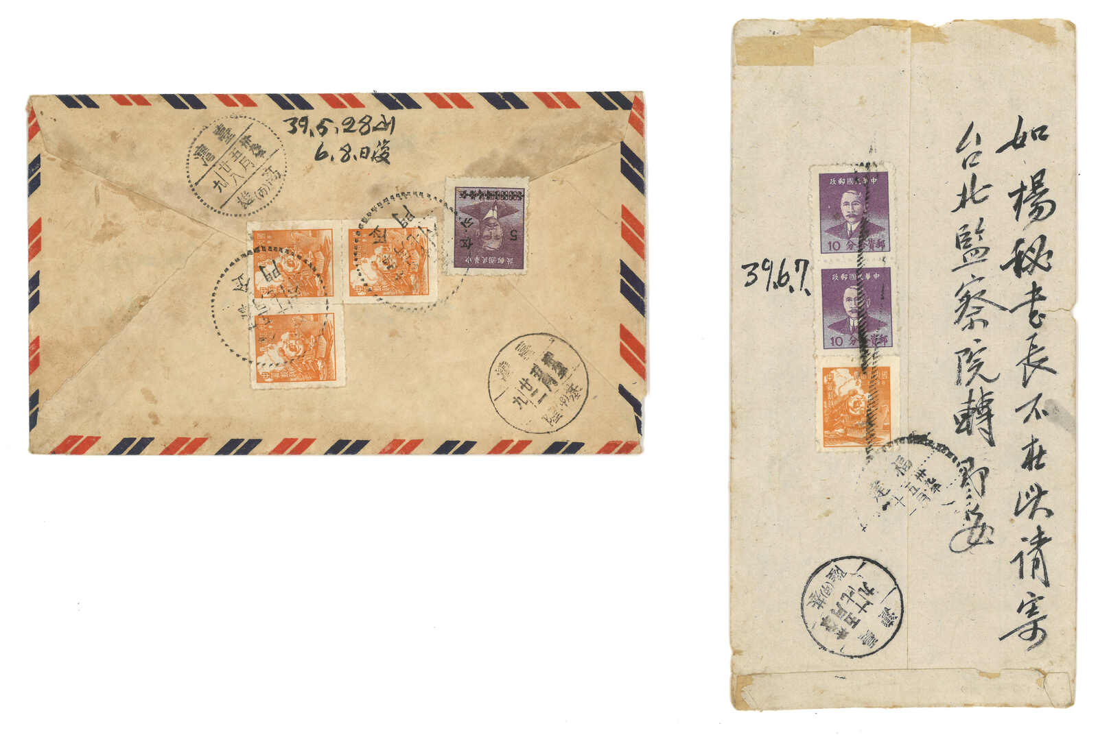 1950 (May) a pair of covers from the miliary on Kinmen to Keelung, f.w. domestic letter unit stamp, SYS Silver Yuan and surch issues, tied by rim of postmark or Fukkien Kinmen cds. Arrived Keelung. One cover was seny by