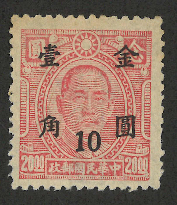 1948年上海永寧加蓋金圓1角,蓋於重慶中華版孫像20元新(陳目G41),無貼上品。(Image 1)