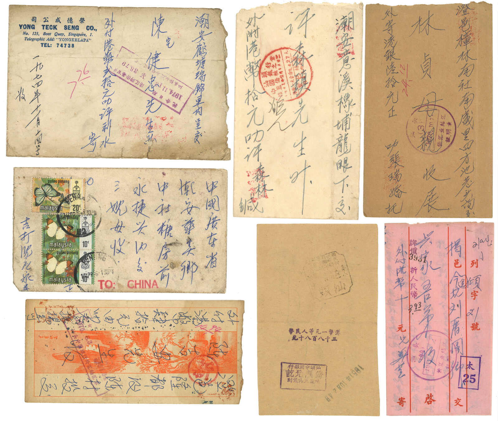 1950-1970s a collection of 27 remittance covers from Singapore and Kuala Lumpur to Swatow, applied with various Qiaopiju seals, BOC Swatow seals and remittance instructional cachets. Plus several 3 Singapore bank remittance