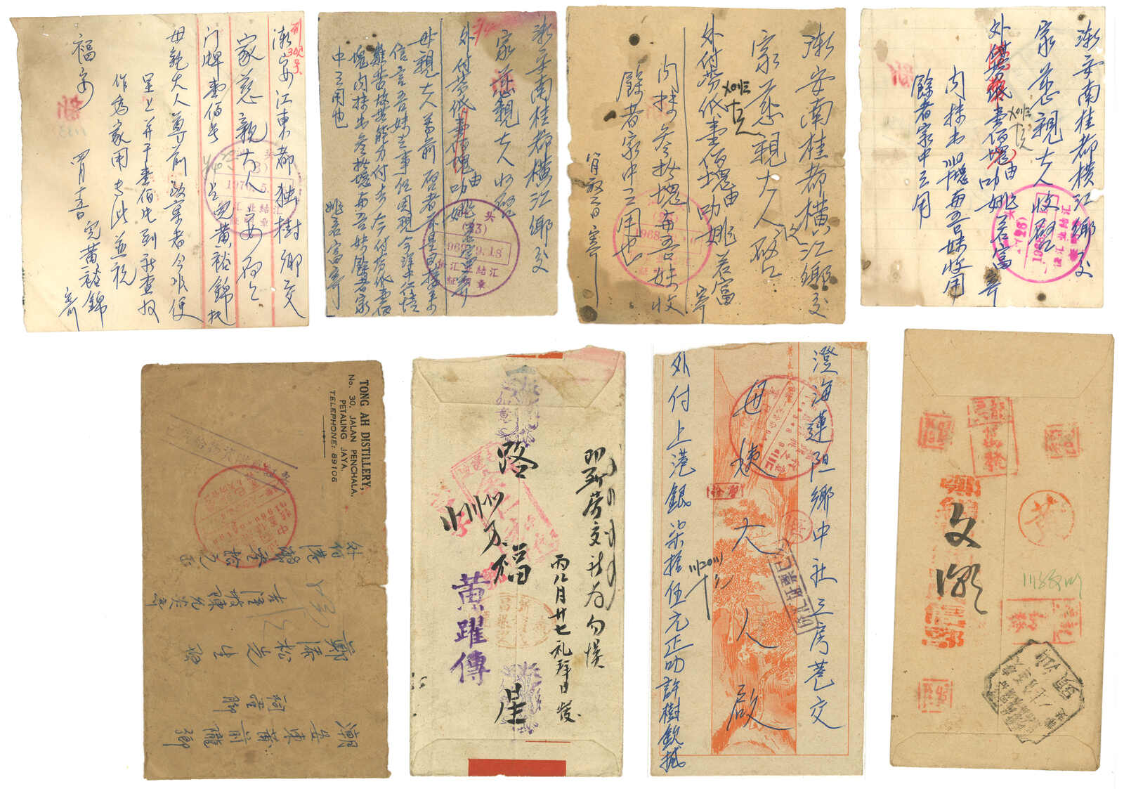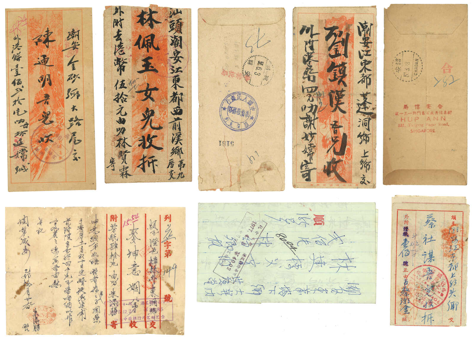 1950至1960年代一組27件新加坡或吉隆坡寄汕頭銀信,鈐不同僑批局戳記、汕頭中國銀行戳記及僑匯指示戳,另附三件新加坡銀行之匯款單。相當豐富。(Image 1)