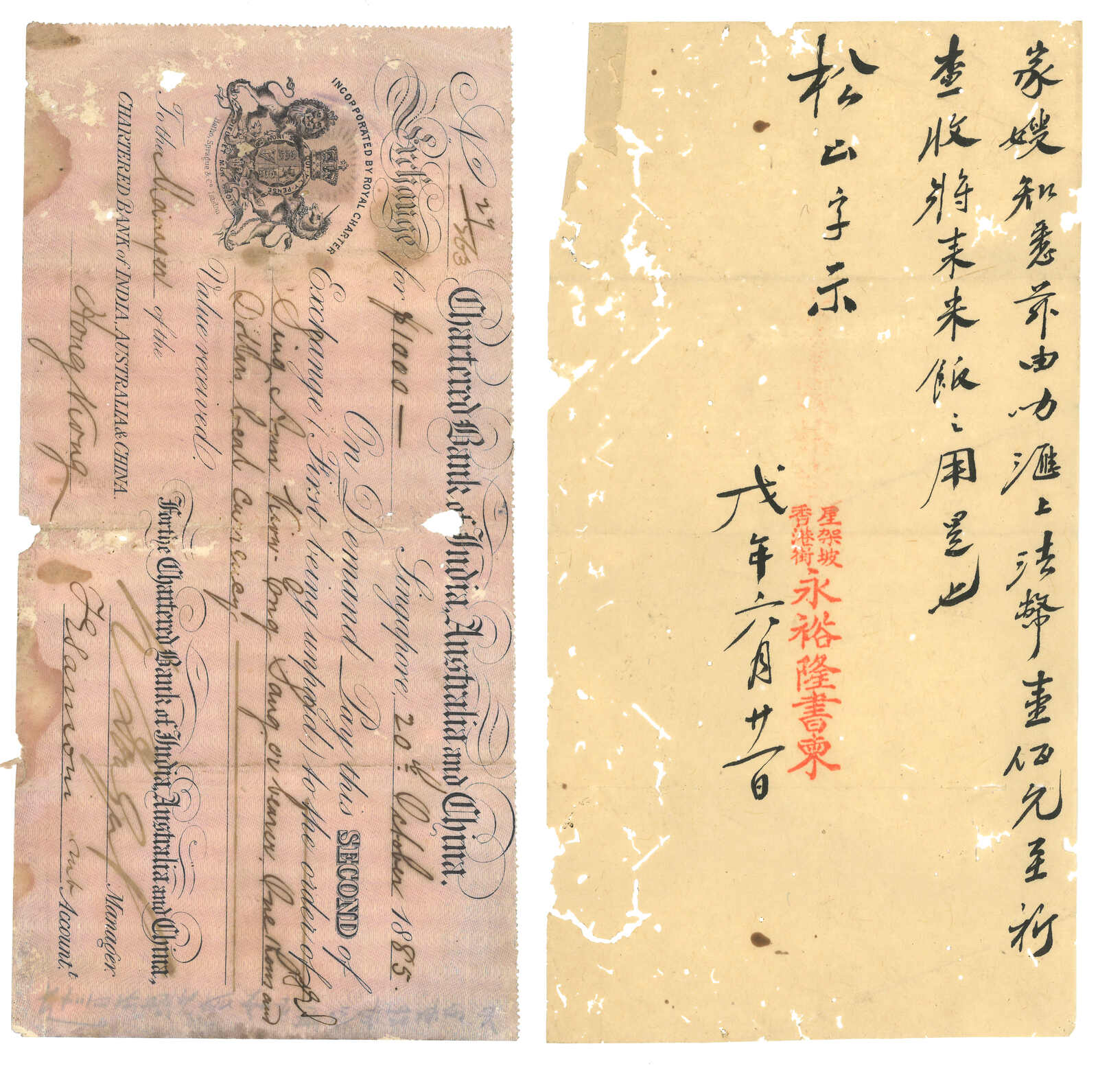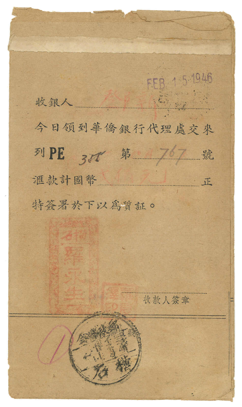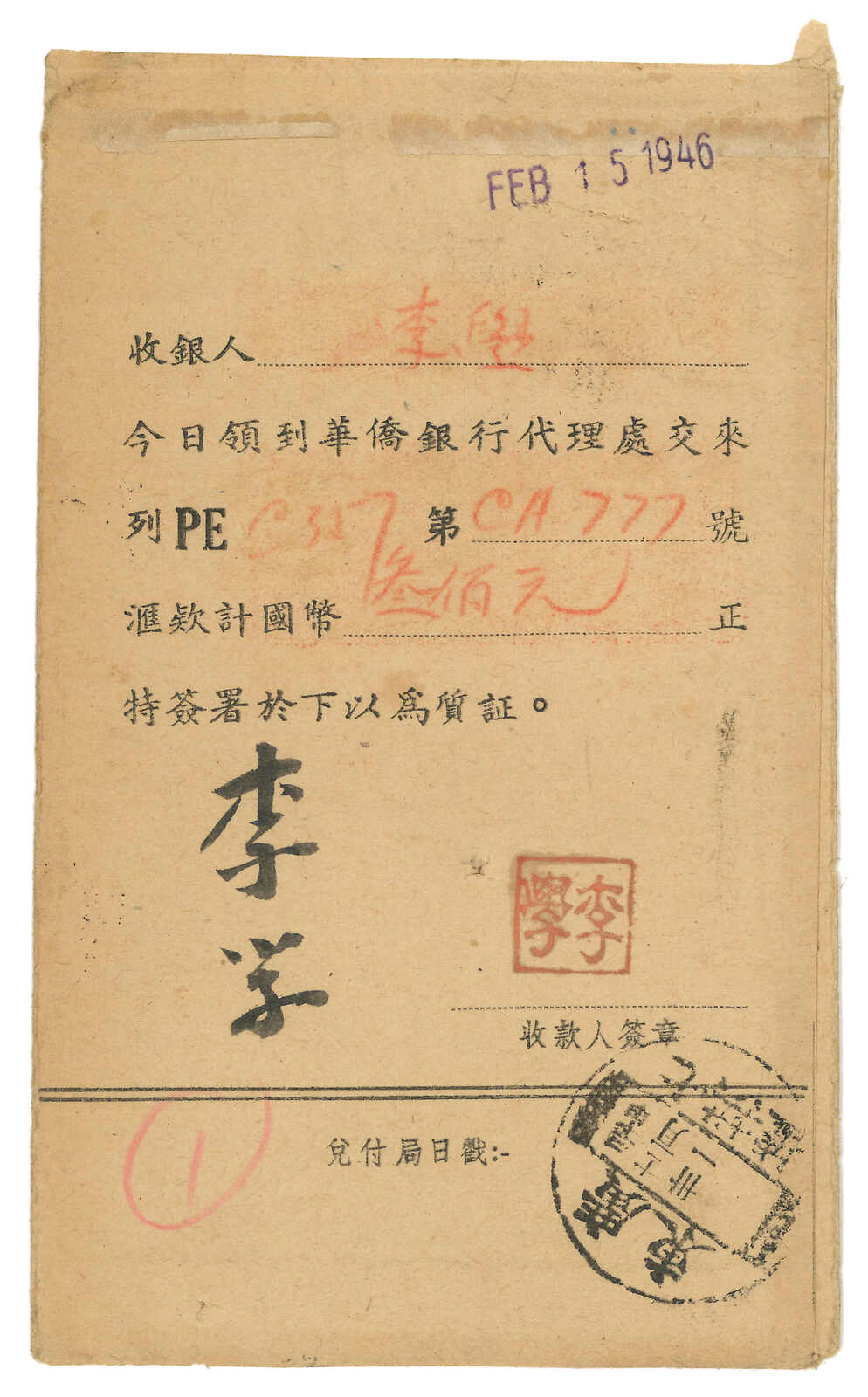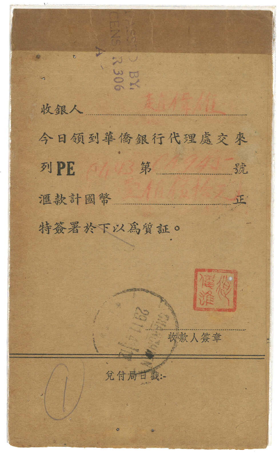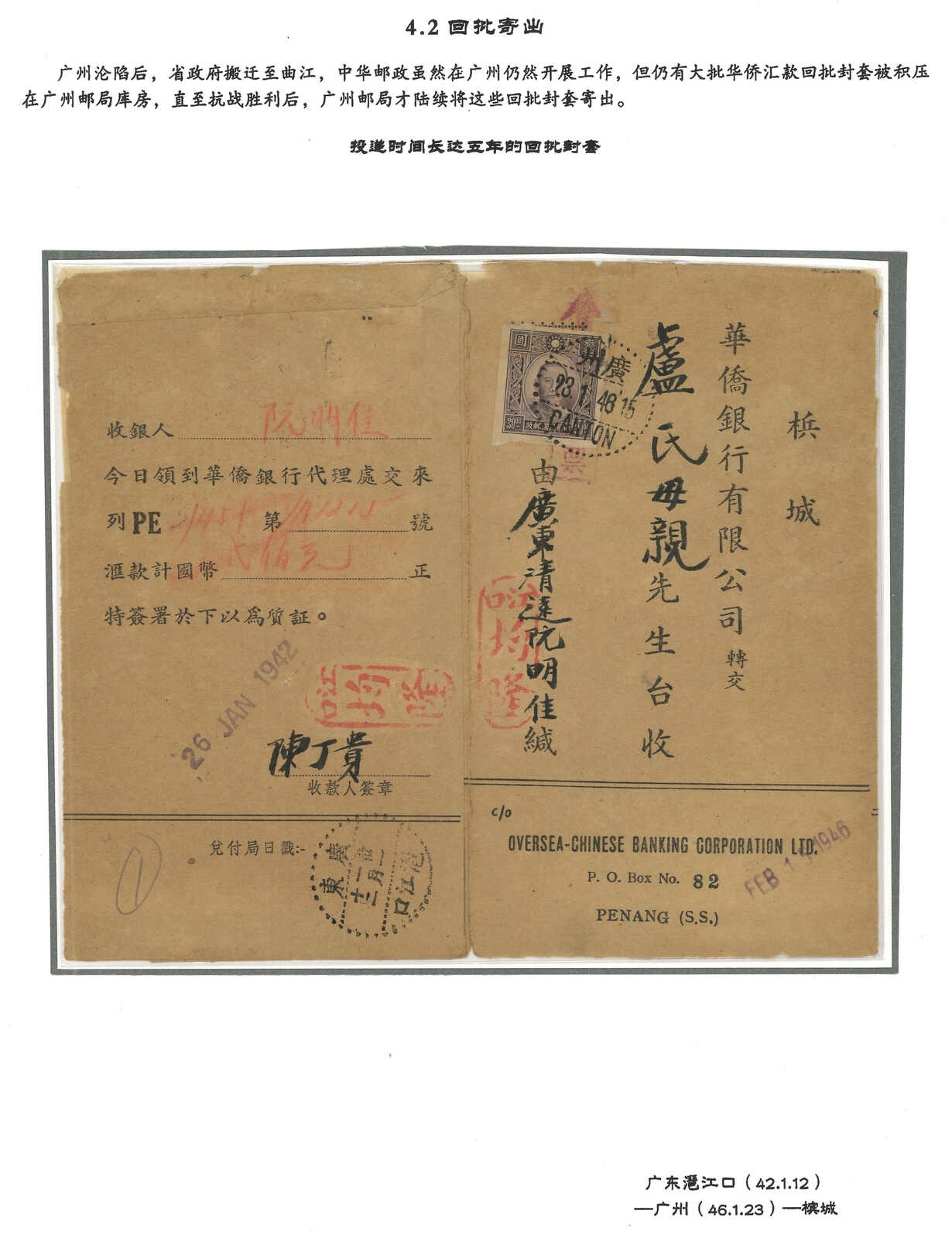 1942 OCBC Hupi (receipt of remittance) from Pokiangkow (12 Jan) to Penang, applied with Kwangtung Pokiangkow origin cds. F.w. SYS $30, tied by Canton (23 Jan 1946) cds. Many Hupui were detained in Canton during Japanese