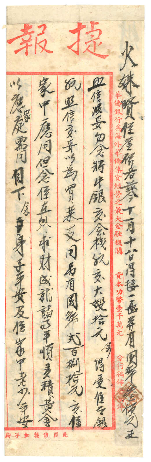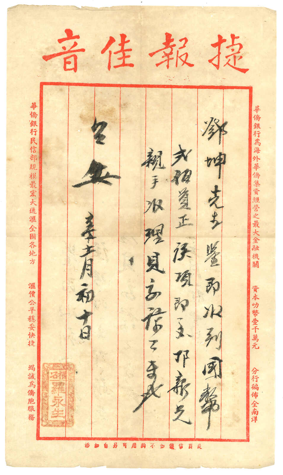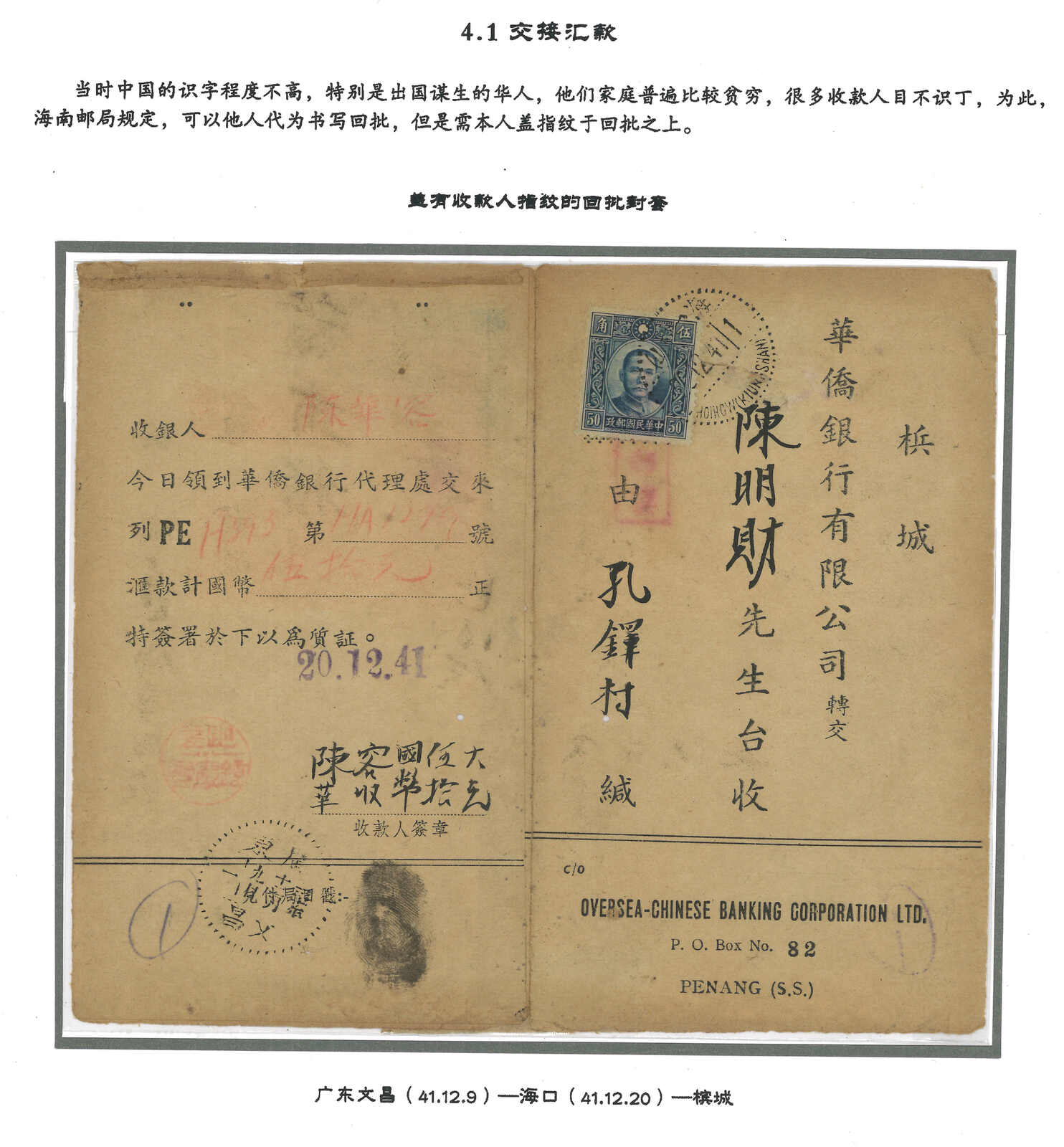 1941.12.9 華僑銀行回批,自文昌寄檳城,鈐廣東文昌始發日戳。貼孫像5角,銷海口12.20中轉戳。 收款人可能為文盲,故打上其指紋。由於潮汕地區僑批局林立,故郵政匯款反而少見。許茂春著 《東南華人與僑批》第216頁5-61原件。(Image 1)