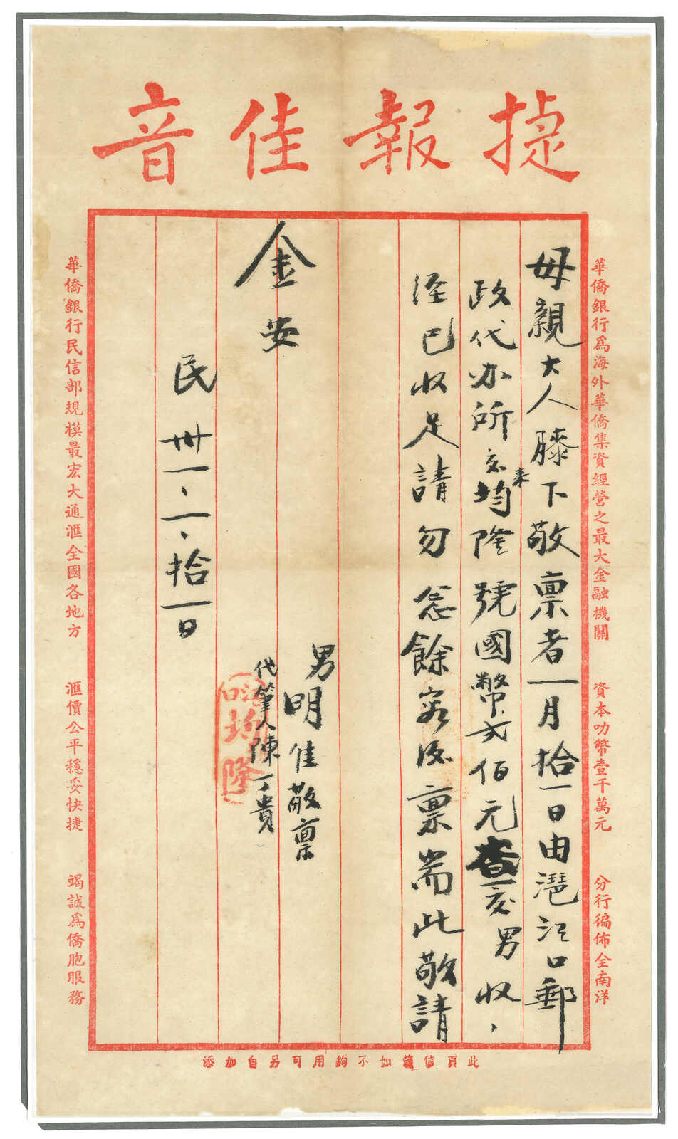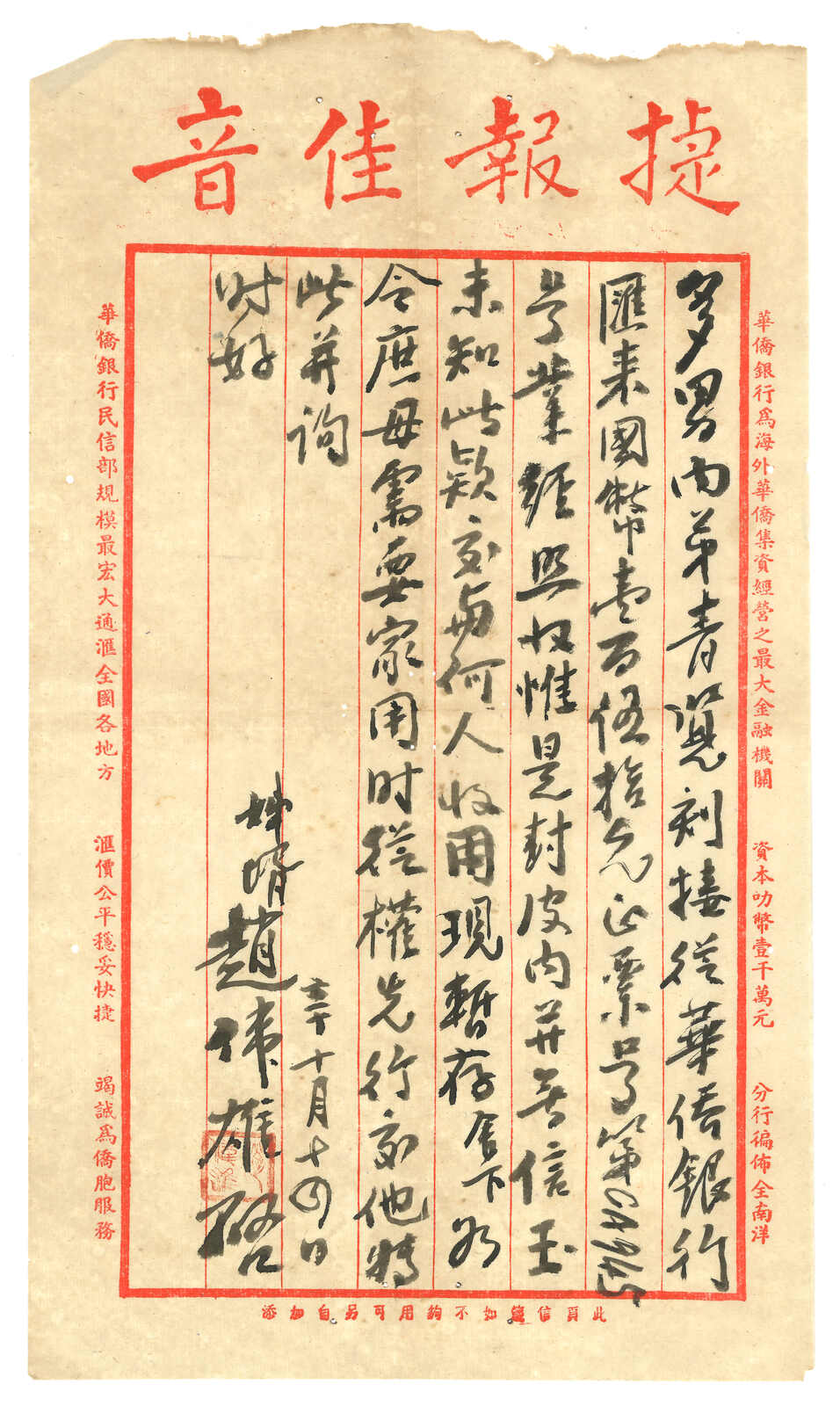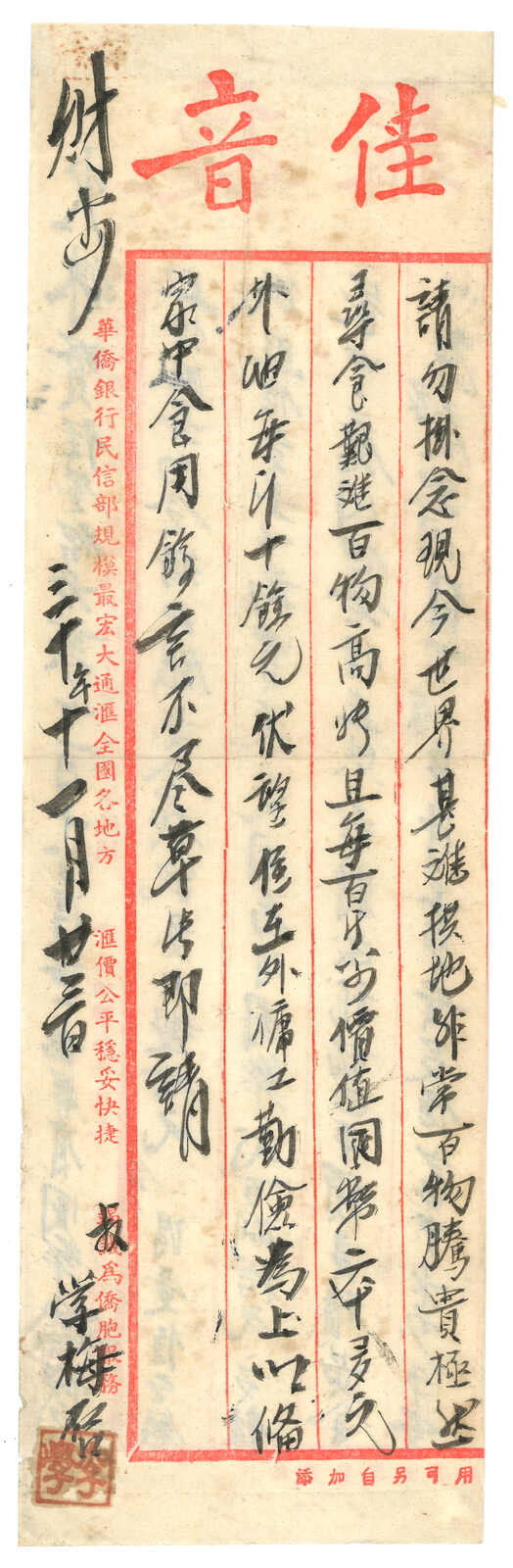 1941.12.9 華僑銀行回批,自文昌寄檳城,鈐廣東文昌始發日戳。貼孫像5角,銷海口12.20中轉戳。 收款人可能為文盲,故打上其指紋。由於潮汕地區僑批局林立,故郵政匯款反而少見。許茂春著 《東南華人與僑批》第216頁5-61原件。(Image 1)