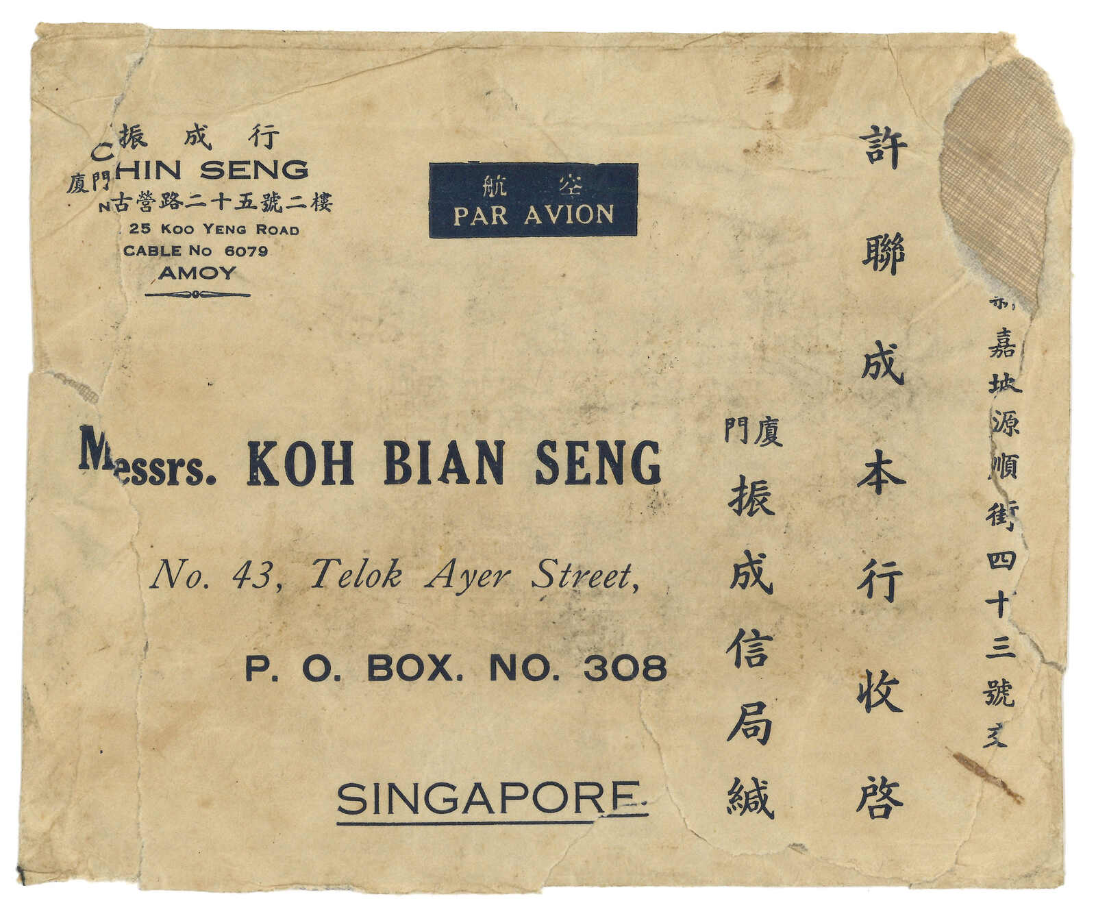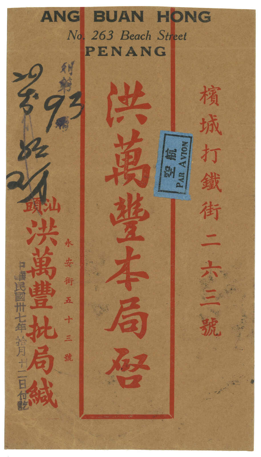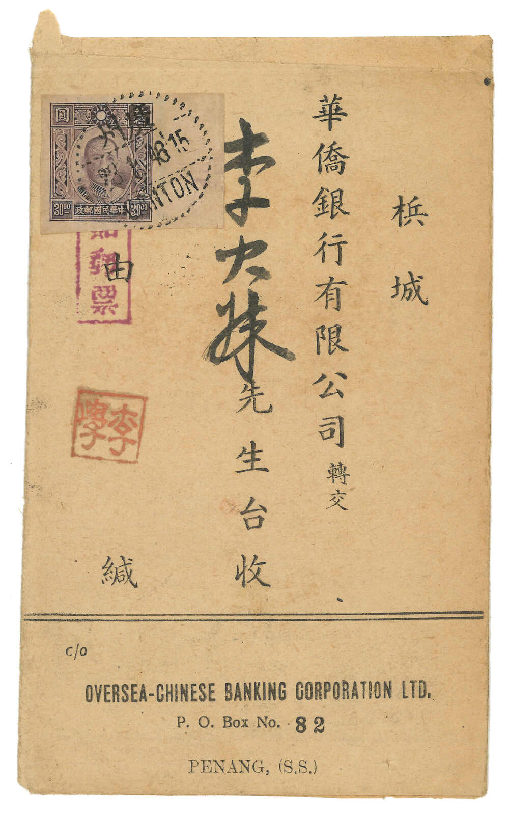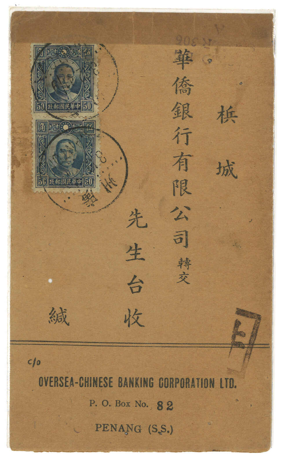was international settlement and fell until Dec 1941. Most OCBC Huipi were addressed to Penang. Destinations other than Penang are very scarce.