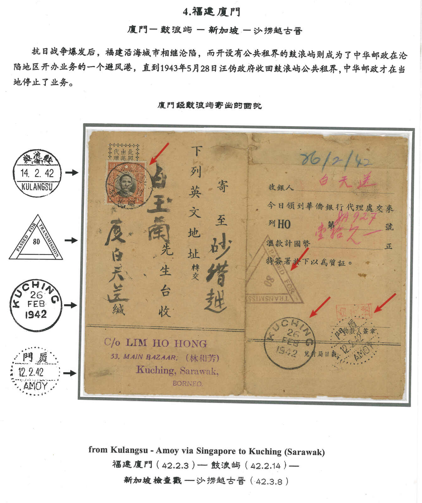 1942 OCBC Huipi (receipt of remittance) from Amoy (12 Feb) to Kuching, applied with Amoy origin cds. F.w. SYS $1, tied by Kulangsu (14 Feb) cds. Applied with Singapore triangular censor mark. Arrived Kuching (8 Mar). Kulangsu
