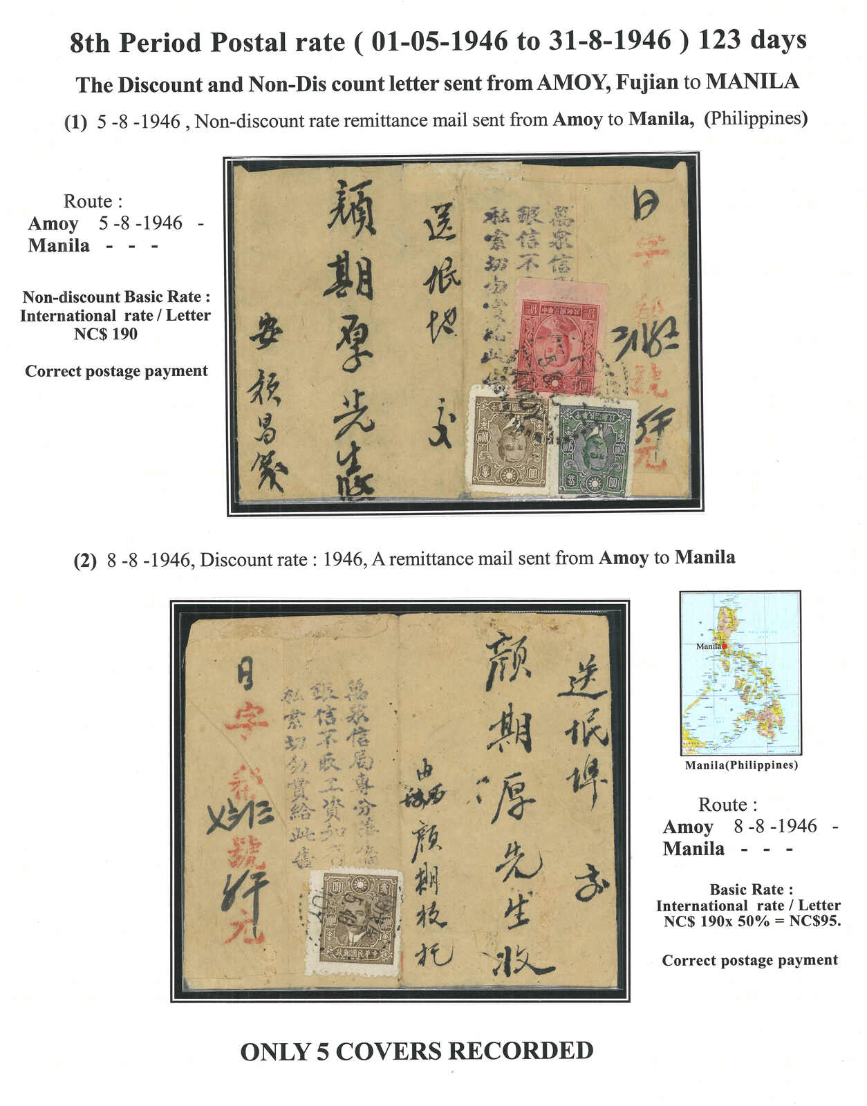 1946年一對廈門寄菲律賓回批,分別貼孫像合130元及100元, 銷廈門三格點線日戳,反映了正常國外信函郵資及減半特惠郵 資。背面帶有批局警示標語、字軌及編號。戰後僑批局重現繁 榮。當中一件為許茂春著《東南亞華人與僑批》第168頁3-62 原件。(Image 1)