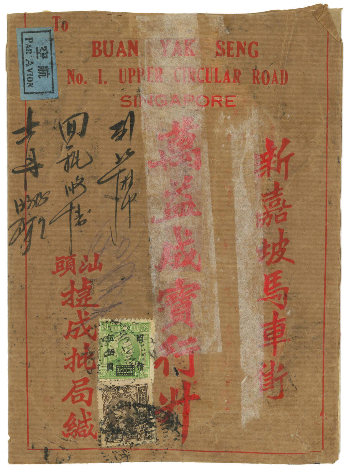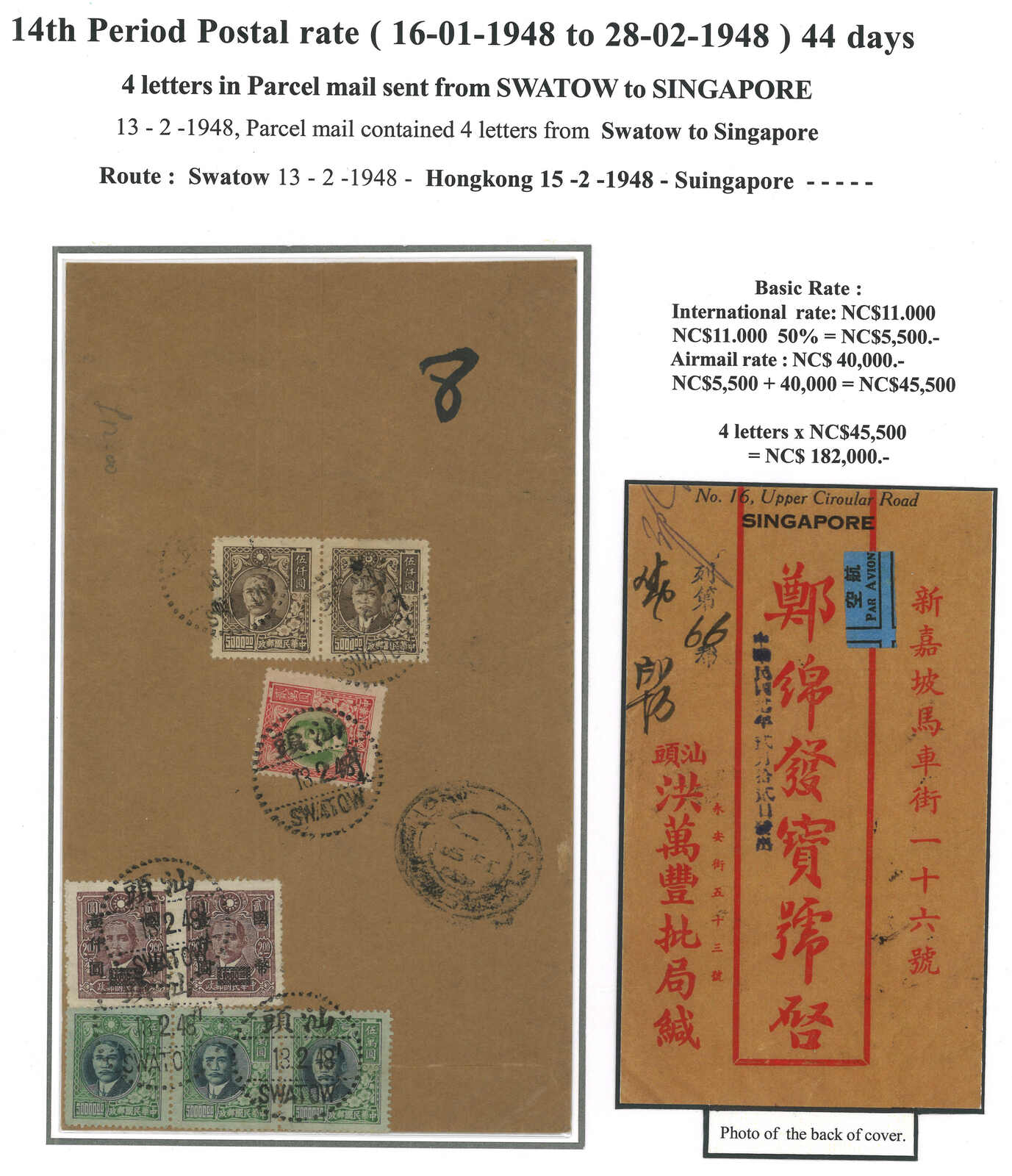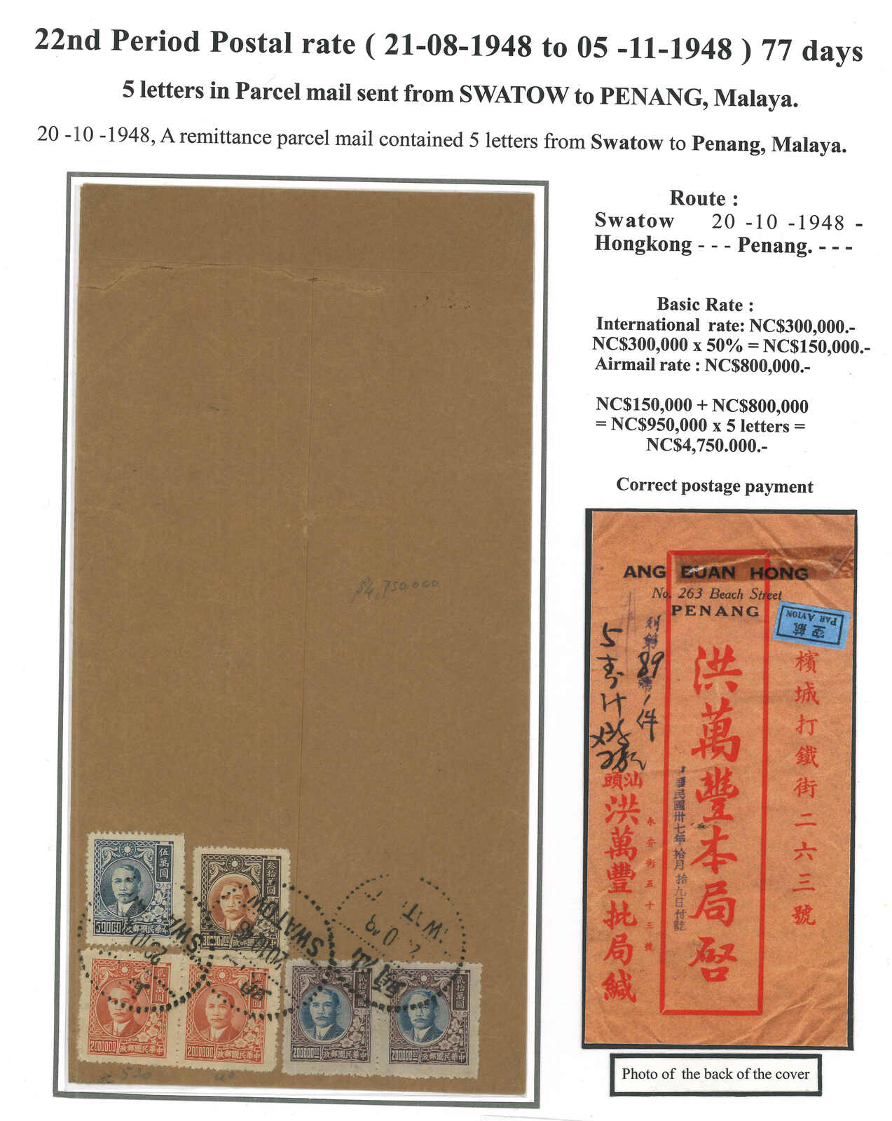 1947.5.20 回批總包,申報內裝回批四件,自汕頭寄新加坡,貼孫像 + 孫像改值國幣22枚,合8000元 (每件回批特惠半費郵資550元 + 航空費1450元,共四件),銷汕頭三格點線日戳。稀罕難得之僑批總包例子。(Image 1)