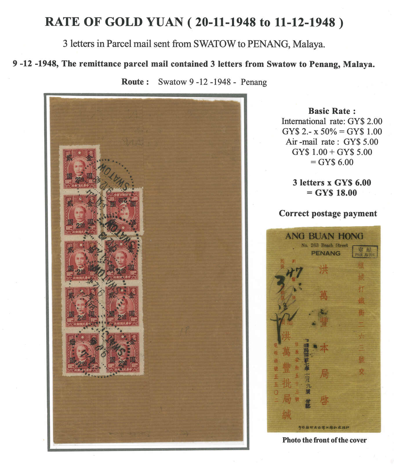 1948 (12 Sep) Huipi (receipt of remittance) bulk mail stating containing 3 letters from Swatow to Penang, f.w. SYS surch Gold Yuan $2 x9, in total of $18 (Huipi concessionary half rate $1 + airmail rate $5 per letter), tied by