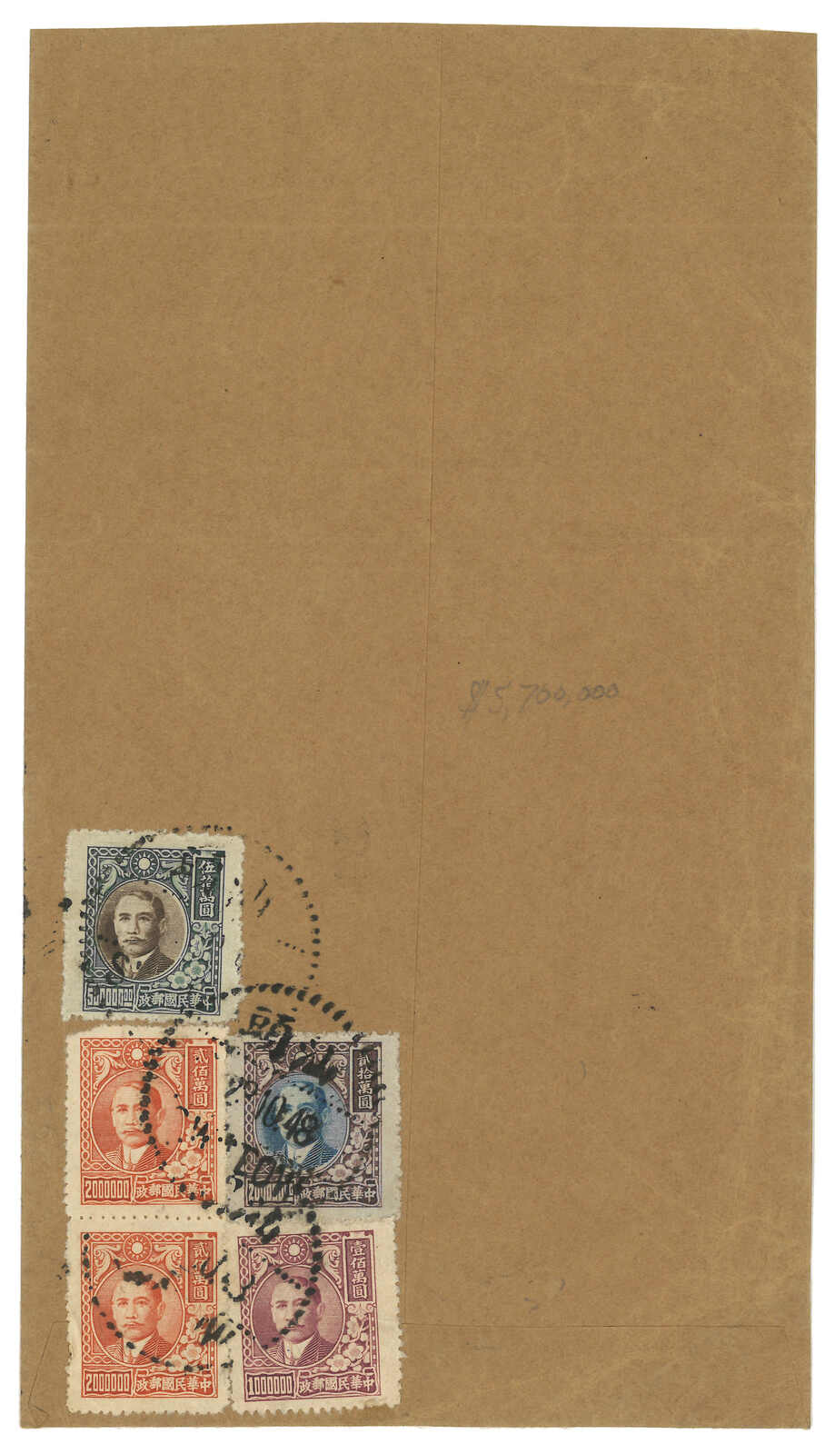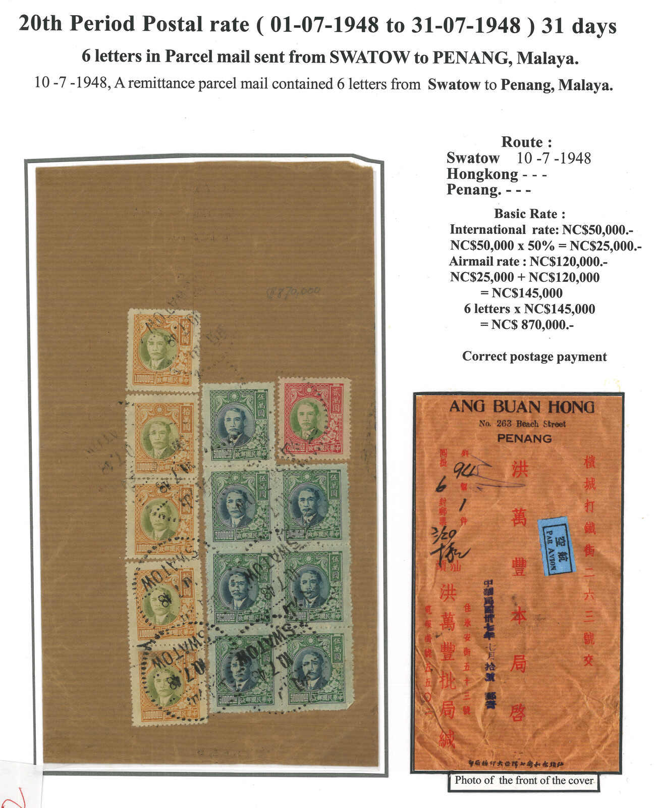 1948.7.10 回批總包,申報內裝回批六件,自汕頭寄檳城,貼孫像13枚,合87萬元(每件回 批特惠半費郵資2萬5千元 + 航空費12萬元,共6件),銷汕頭三格點線日戳。稀罕難得之僑批 總包例子。許茂春著《東南亞華人與僑批》第219頁5-71原件。(Image 1)