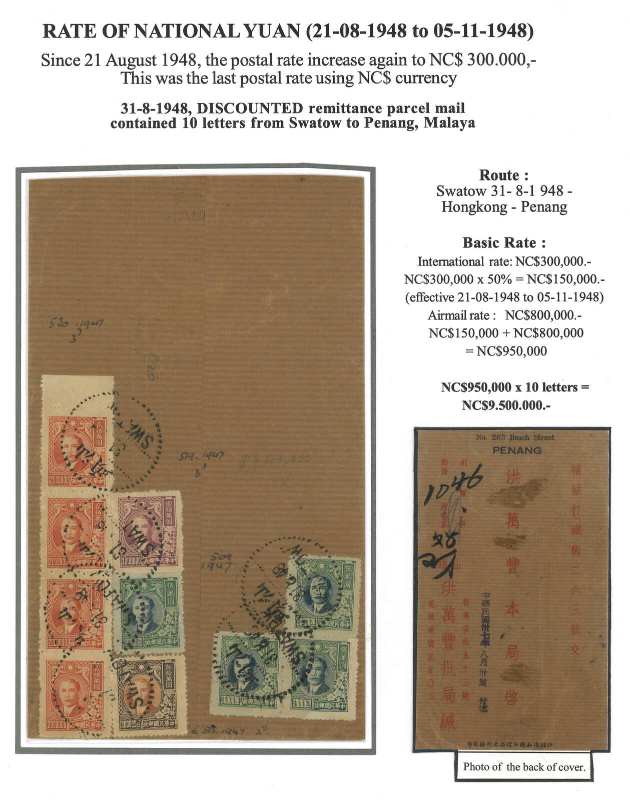1948 (31 Aug) Huipi (receipt of remittance) bulk mail stating containing 10 letters from Swatow to Penang , f.w. SYS x10, in total of $9,500,000 (Huipi concessionary half rate $150,000 + airmail rate $800,000 pe r letter), tied