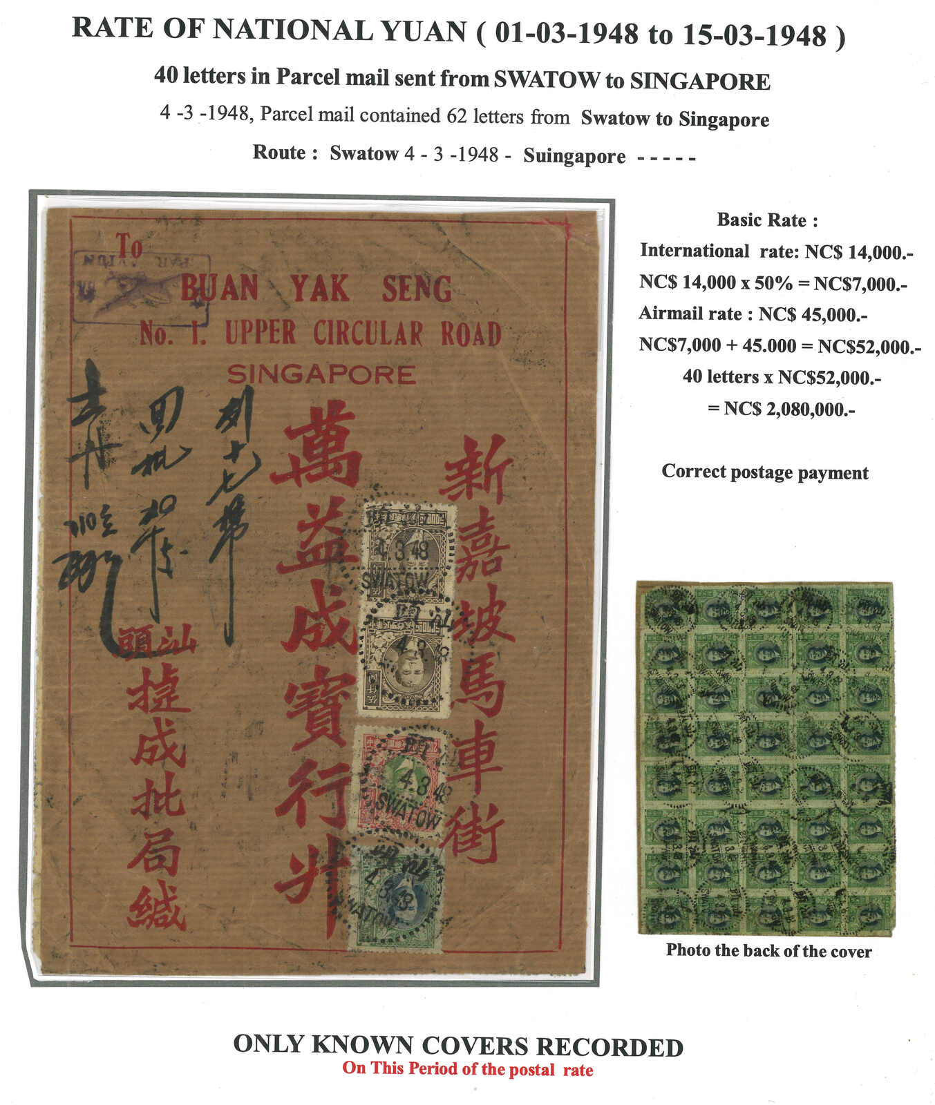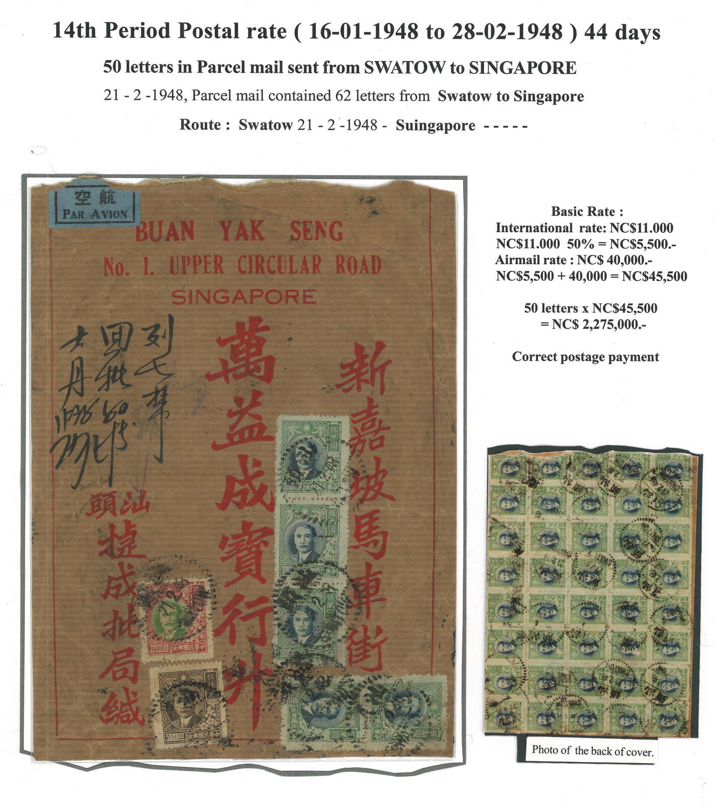 1948.3.4 回批總包,申報內裝回批四十件,自汕頭寄新加坡,貼孫像共44枚,合208萬(每件回批特惠 半費郵資7000元 + 航空費45000元,共40件),銷汕頭三格漢英點線日戳。稀罕難得之僑批總包例子。(Image 1)