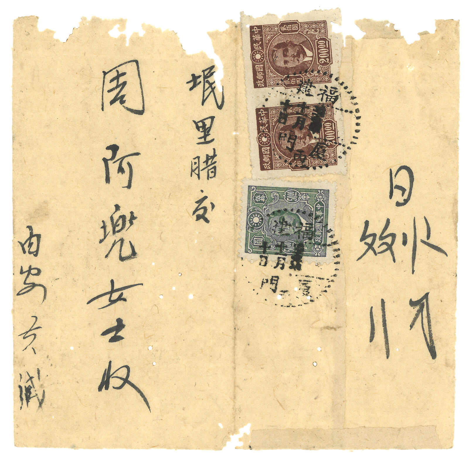 1946 a pair of Huipi from Amoy to Manila, f.w. SYS issue in value of $190 and $100 respectively, tied by Amoy bilingual cds, showcasing normal international rate and concessionary rate. On reverse with Qiaopiju warning cachet,