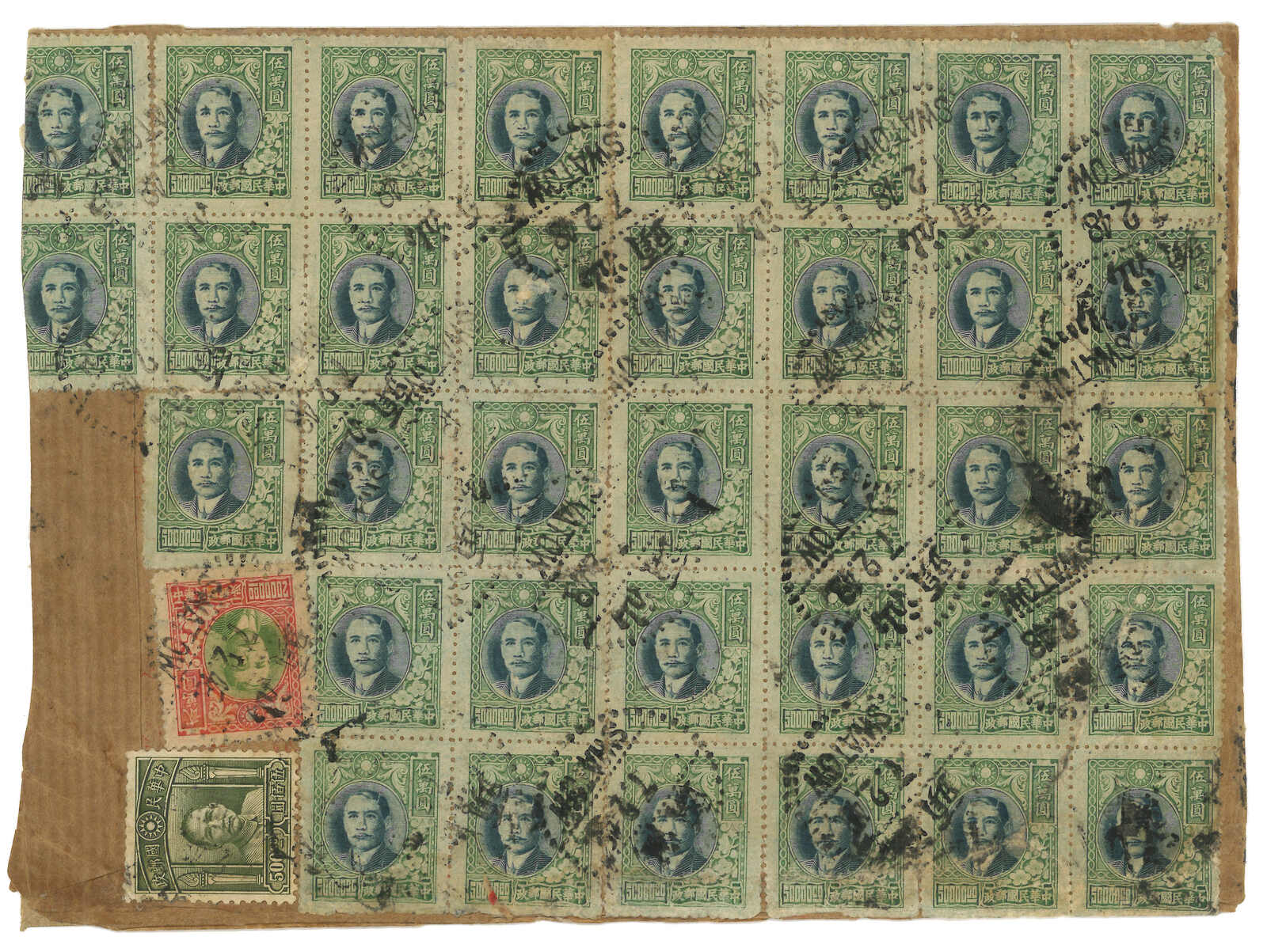 1948.2.21 回批總包,申報內裝回批五十件,自汕頭寄新加坡,正背貼孫像共47枚,合227萬5千元(每件回批特惠半費郵資5500元 + 航空費4萬元,共50件),銷汕頭三格點線日戳。稀罕難得之僑批總包例子。封頂打開。許茂春著《東南亞華人與僑批》第192頁4-64原件。(Image 1)