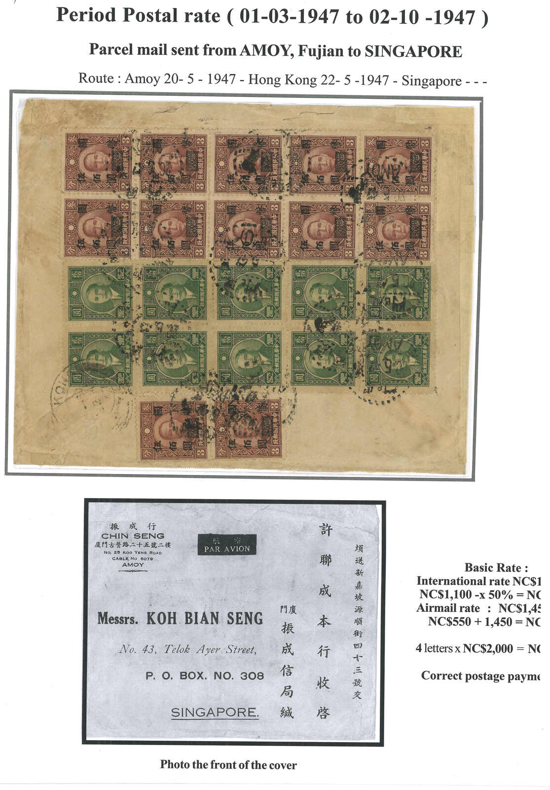 1947.5.20 回批總包,申報內裝回批四件,自廈門寄新加坡,貼孫像 + 改值國幣共22枚,合8000元(每 件回批特惠半費郵資550元 + 航空費1450元,共4件),銷廈門三格點線日戳。5.22經香港。稀罕難得之僑批總包例子。(Image 1)