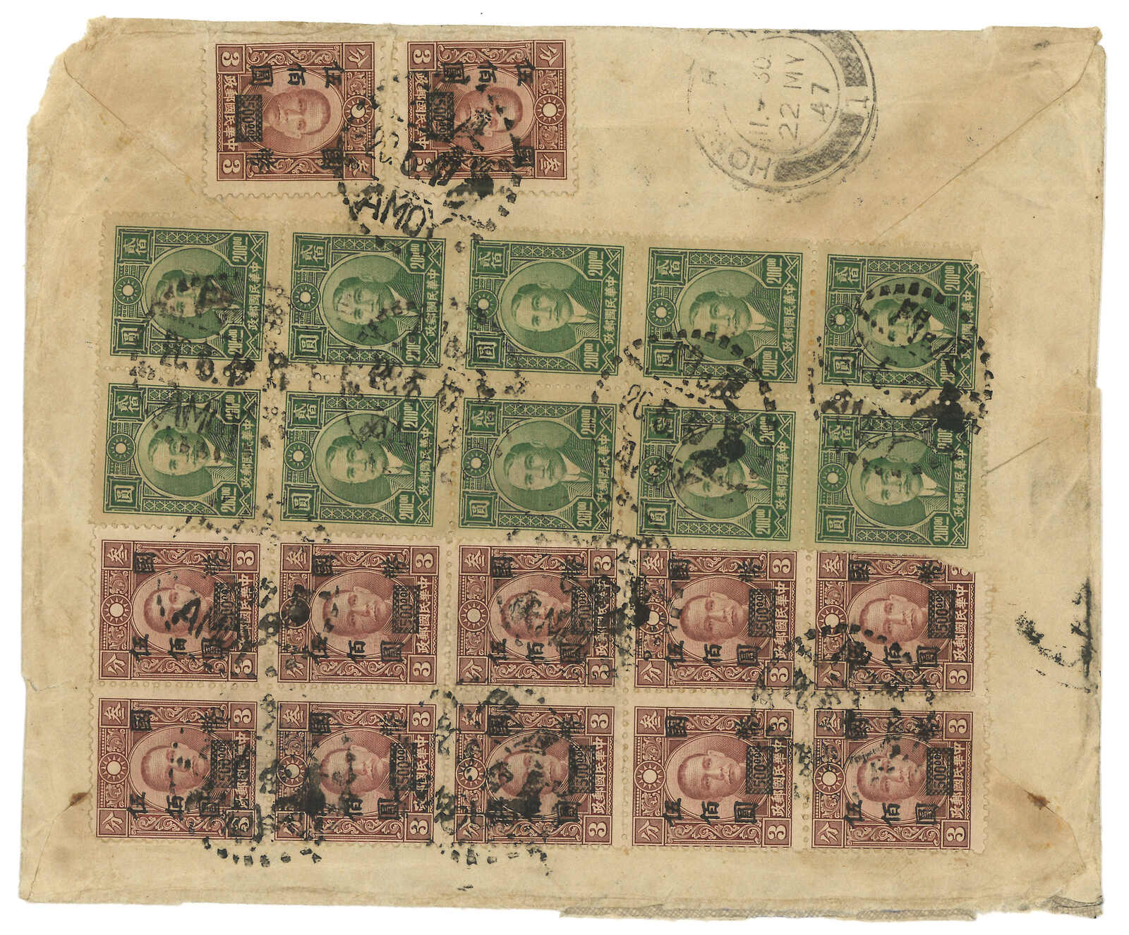 1947.5.20 回批總包,申報內裝回批十件,自廈門寄新加坡,貼重慶中央版孫像200元十方連 + 改值國幣500元12枚,合8000 元(每件回批特惠半費郵資550元 + 航空費1450元,共10件),銷廈門三格漢英點線日戳。稀罕難得之僑批總包例子。(Image 1)