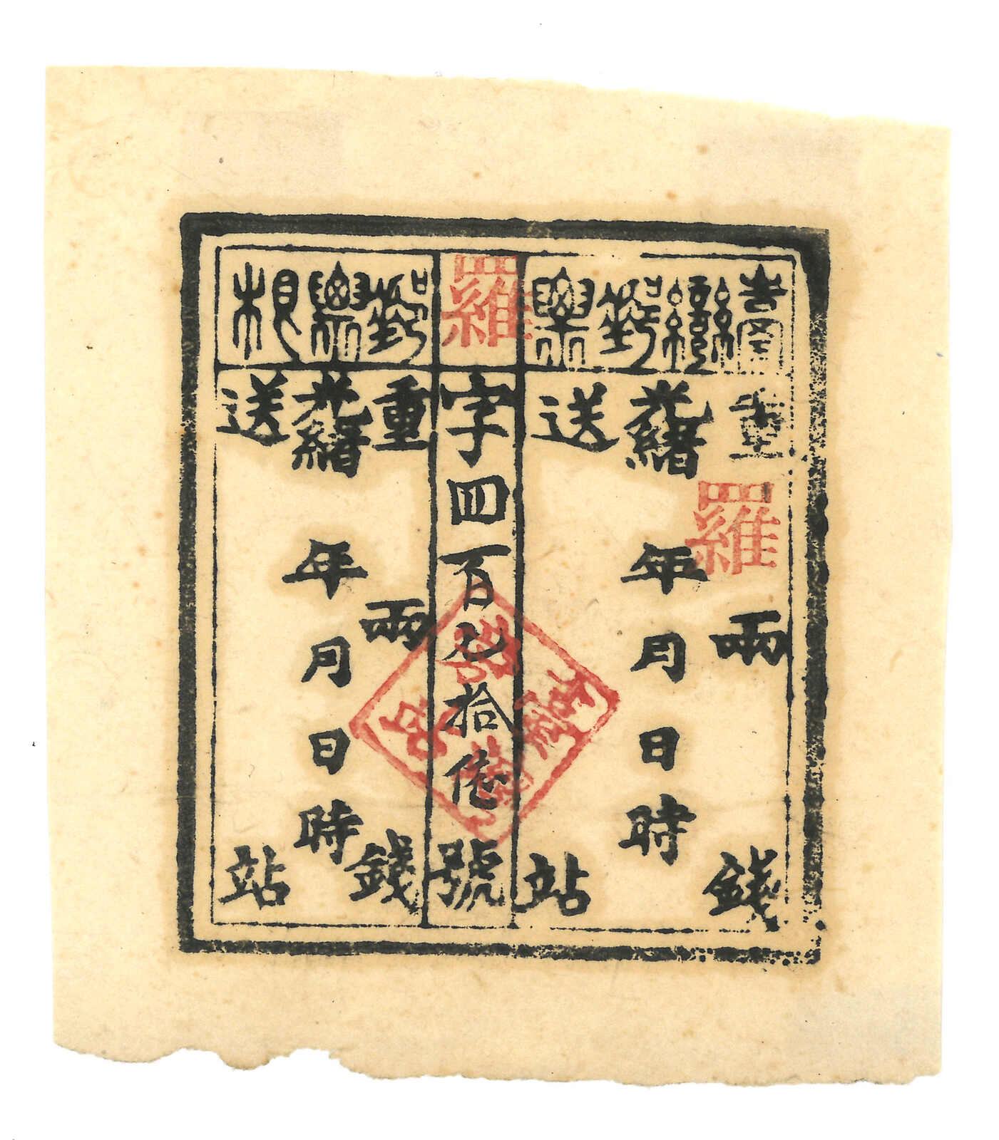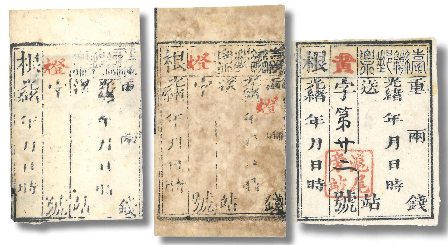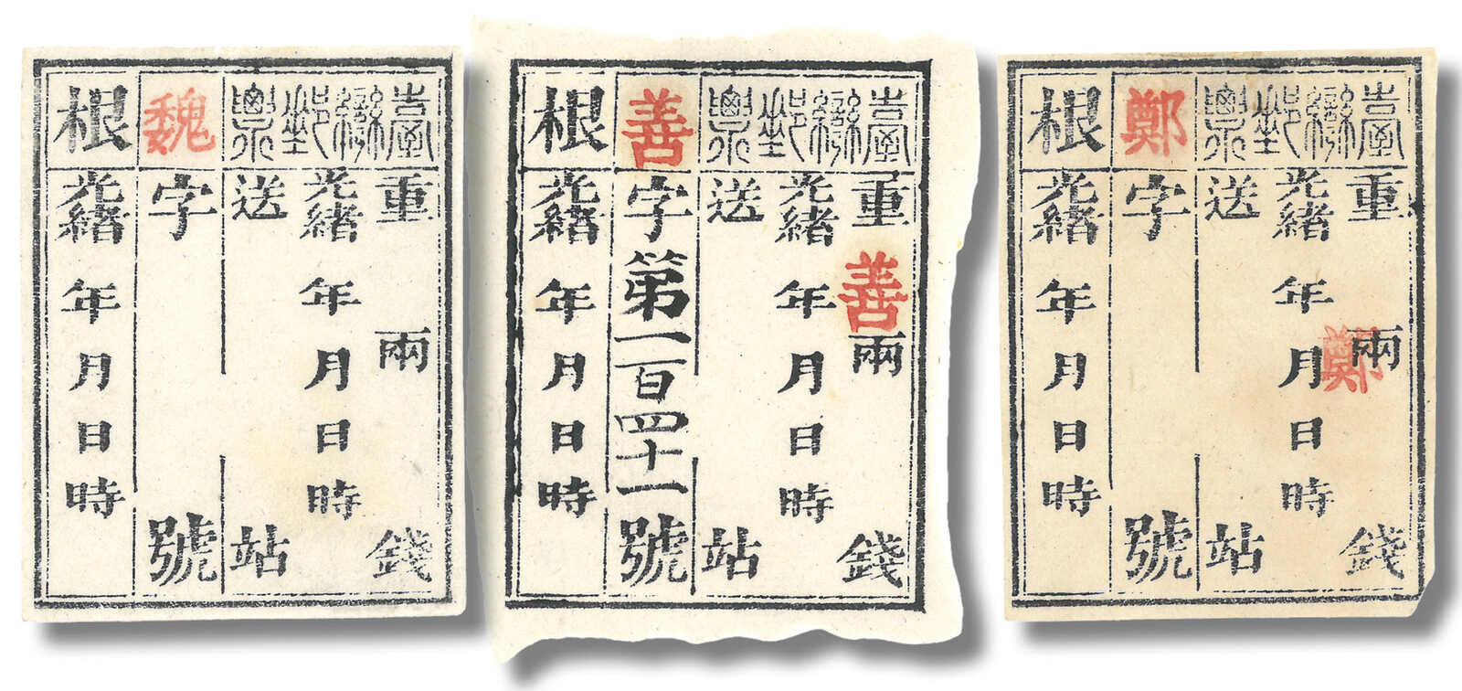 1886年公文用站票第一版一組 三枚,分別印於條紋紙及連史 紙上(陳目F1, F2),當中一 枚鈐“滬尾旁站”紅戳。品相 各異。(Image 1) (Image 2)
