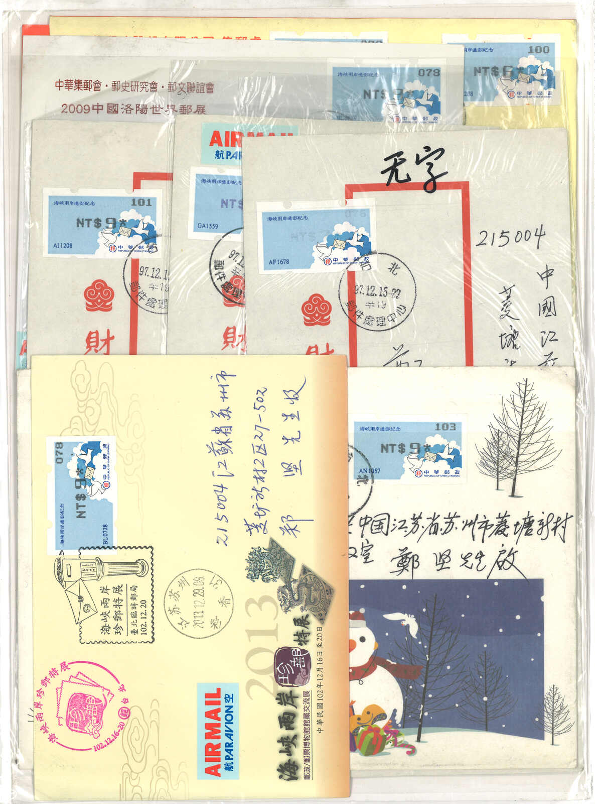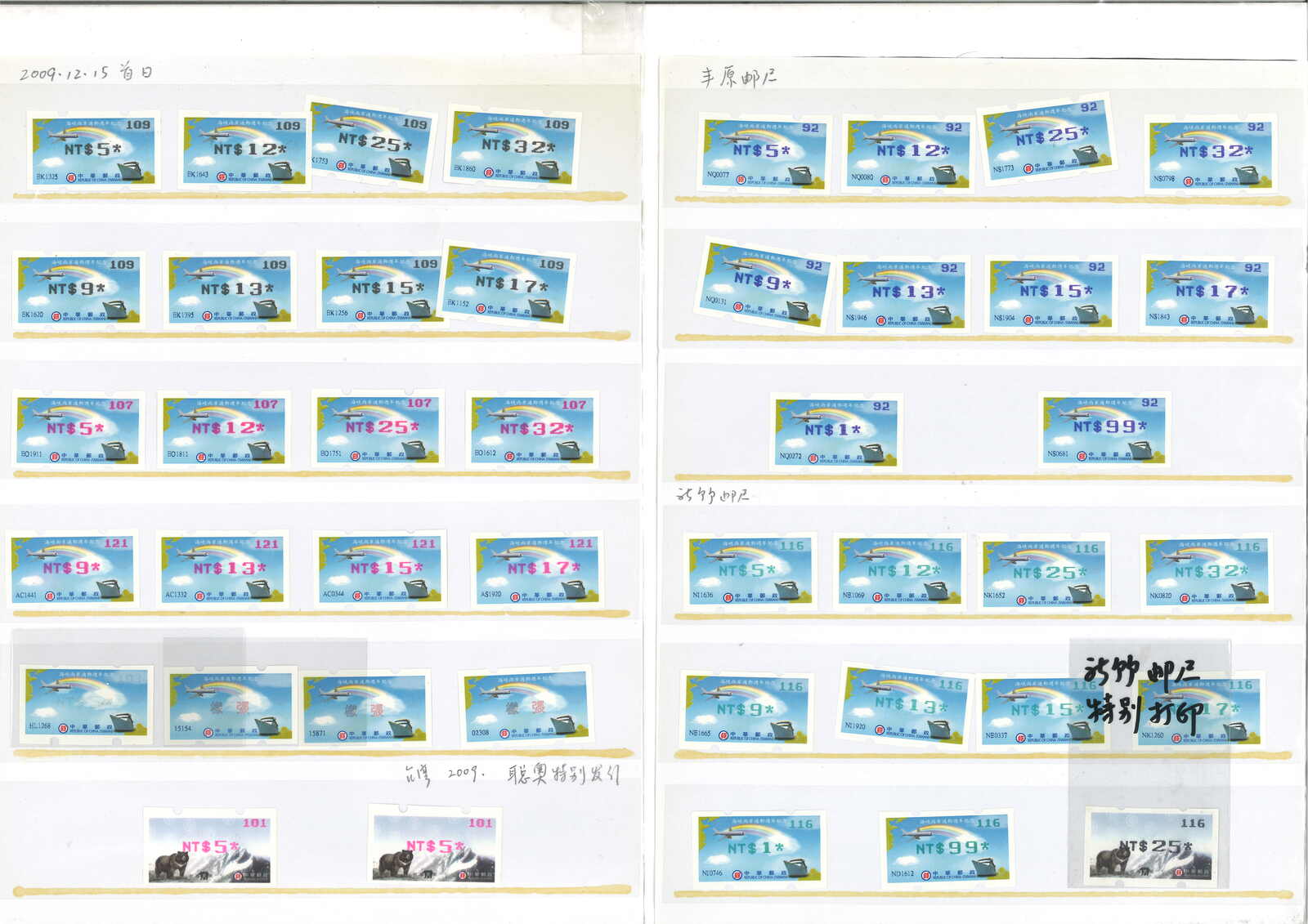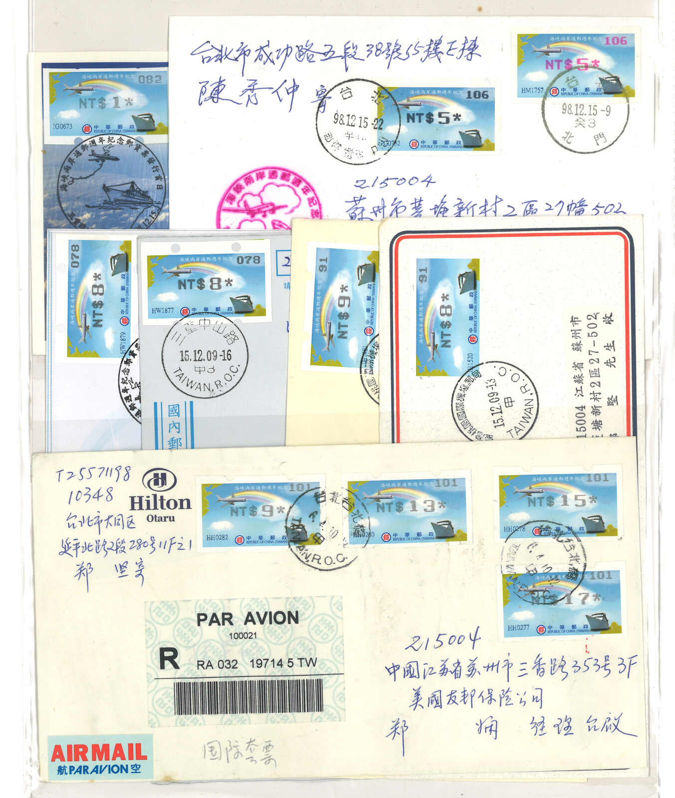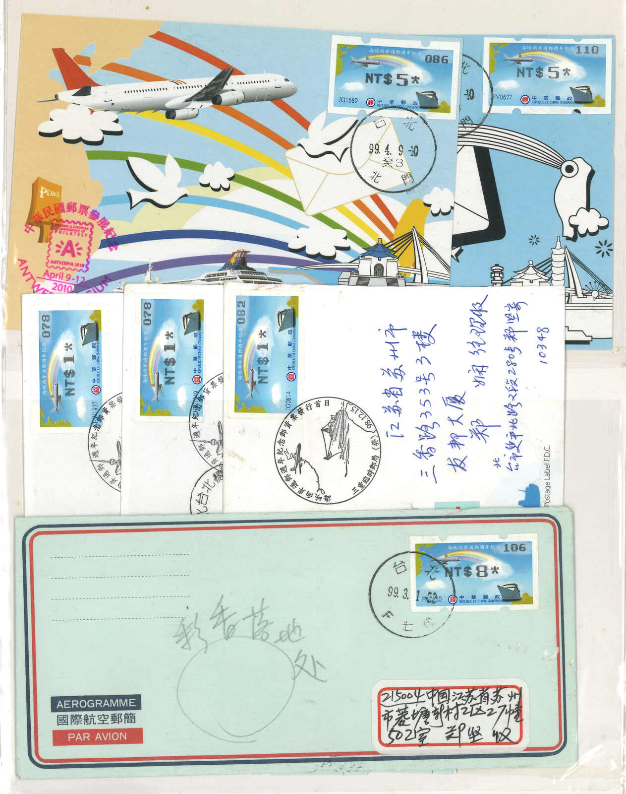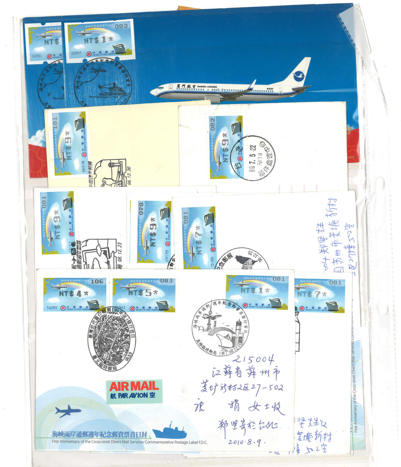 3431 cover image2009 a comprehensive collection of Taiwan 1st Anniv of Cross-strait Direct Mail Service ATM stamps, containing about 150 stamps and 100 covers, including specimen stamps, FDC, commemorative covers, airplane picture postcards etc. Please view.