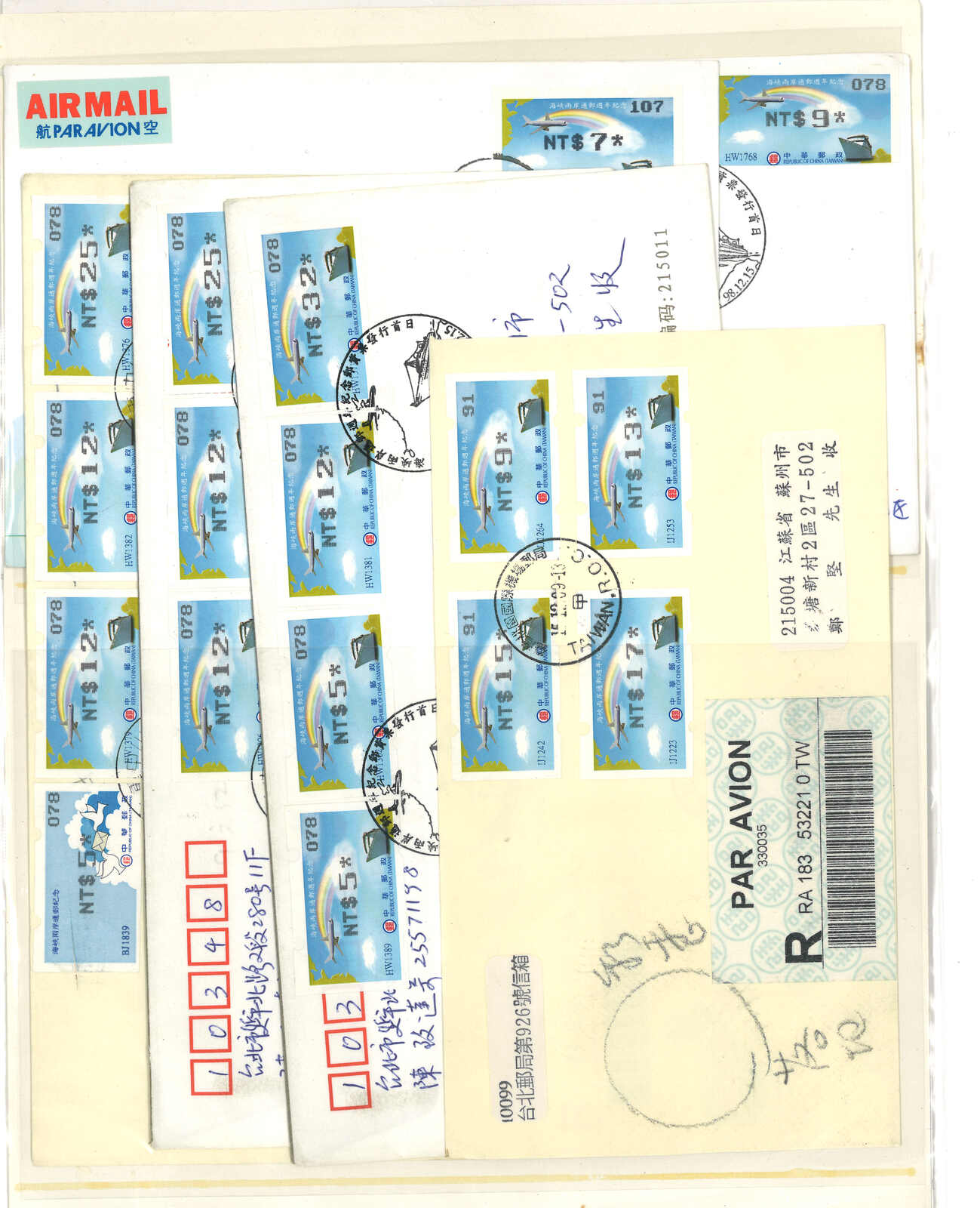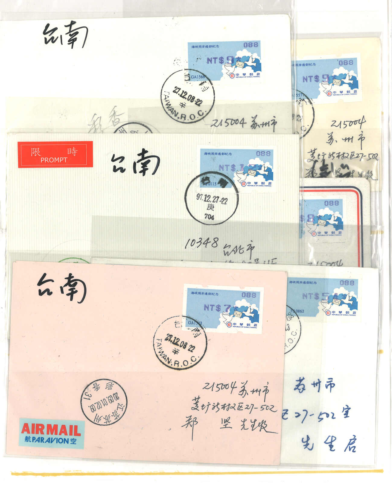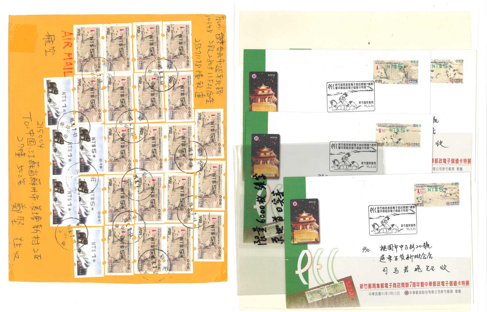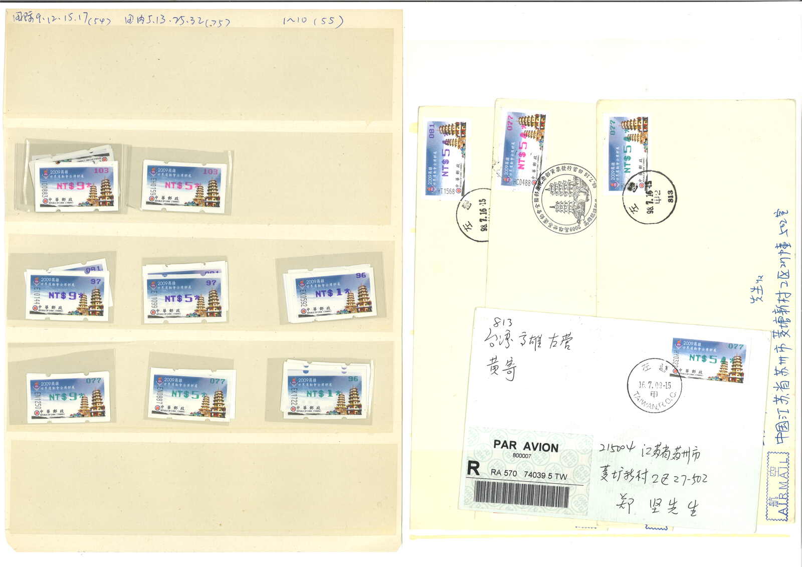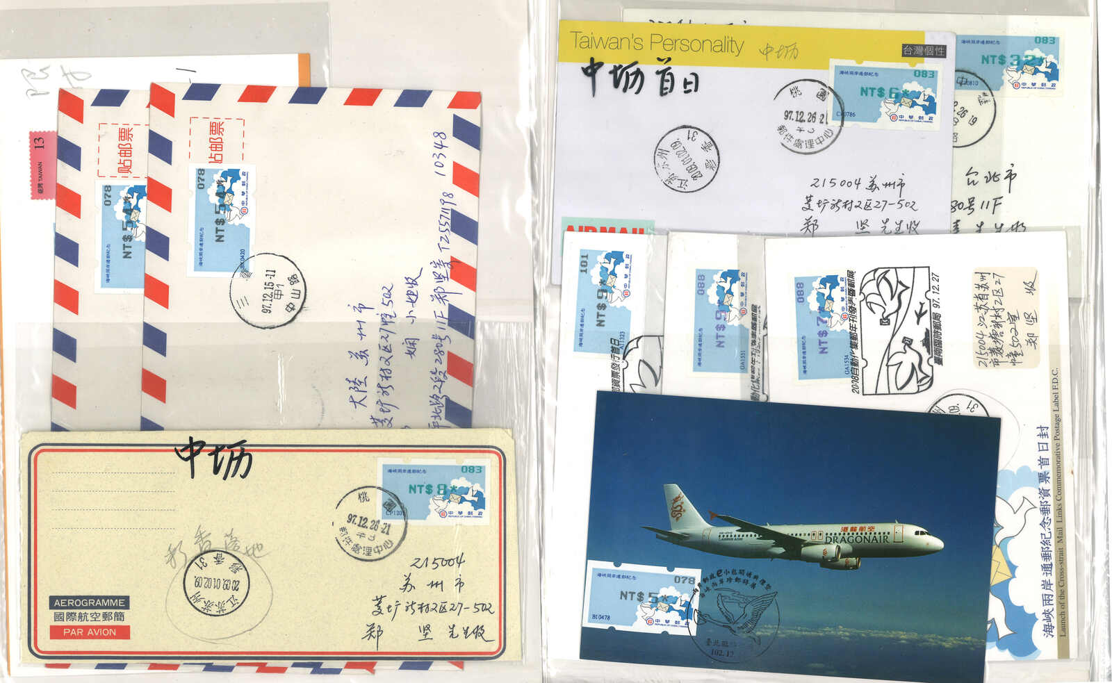 3429 cover image2008 a comprehensive collection of Taiwan Cross-strait Direct Mail Service ATM stamps, containing about 110 stamps and 110 covers, including complete set from all vending marchines, scarce GQ369 stamp, variety stamps, commemotive covers, airplane picture postcards etc. Please view.
