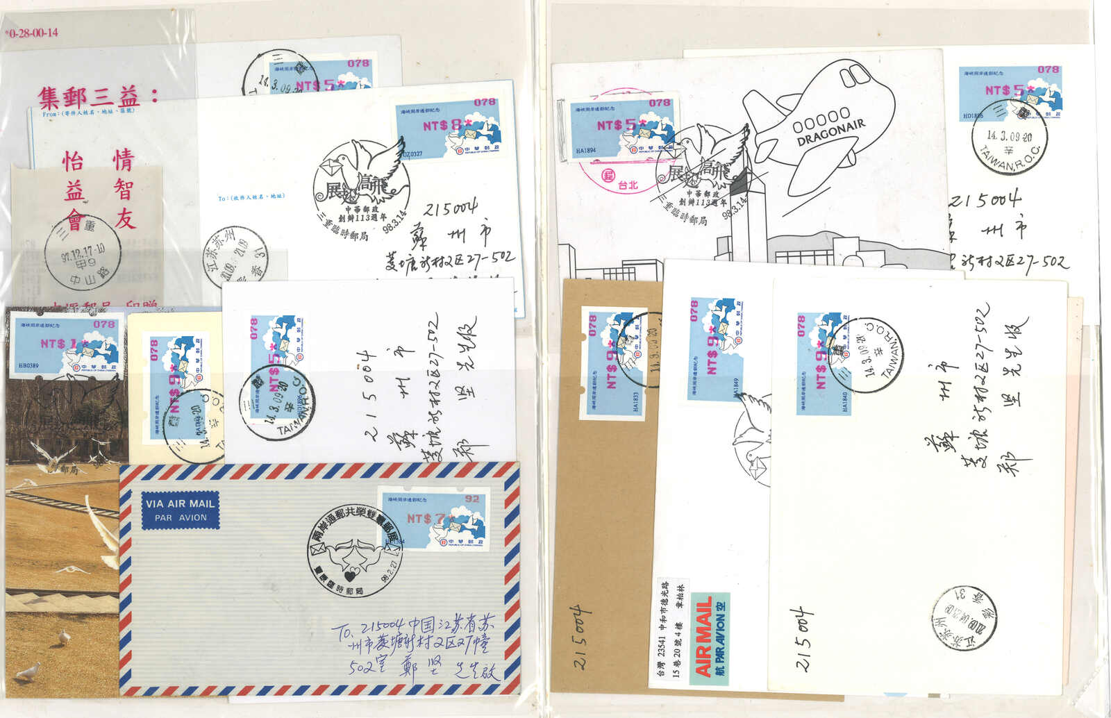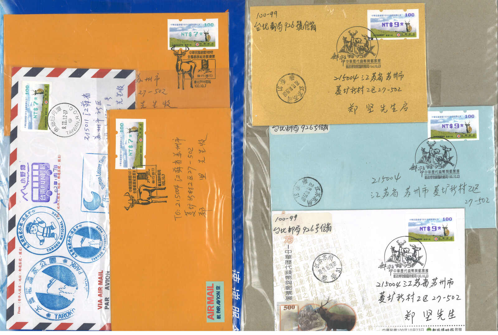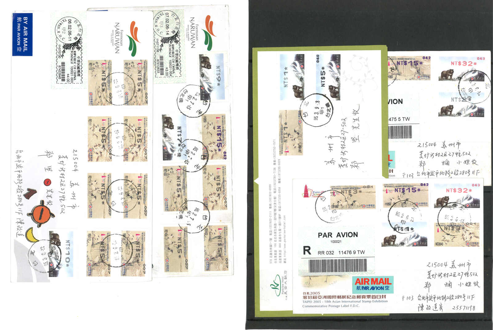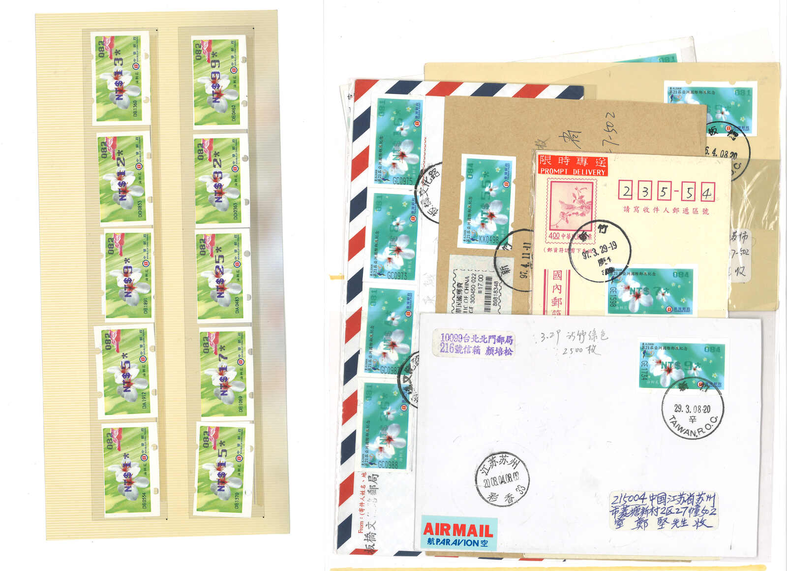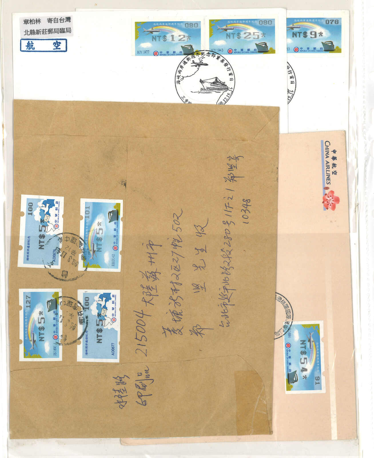 3429 cover image2008 a comprehensive collection of Taiwan Cross-strait Direct Mail Service ATM stamps, containing about 110 stamps and 110 covers, including complete set from all vending marchines, scarce GQ369 stamp, variety stamps, commemotive covers, airplane picture postcards etc. Please view.