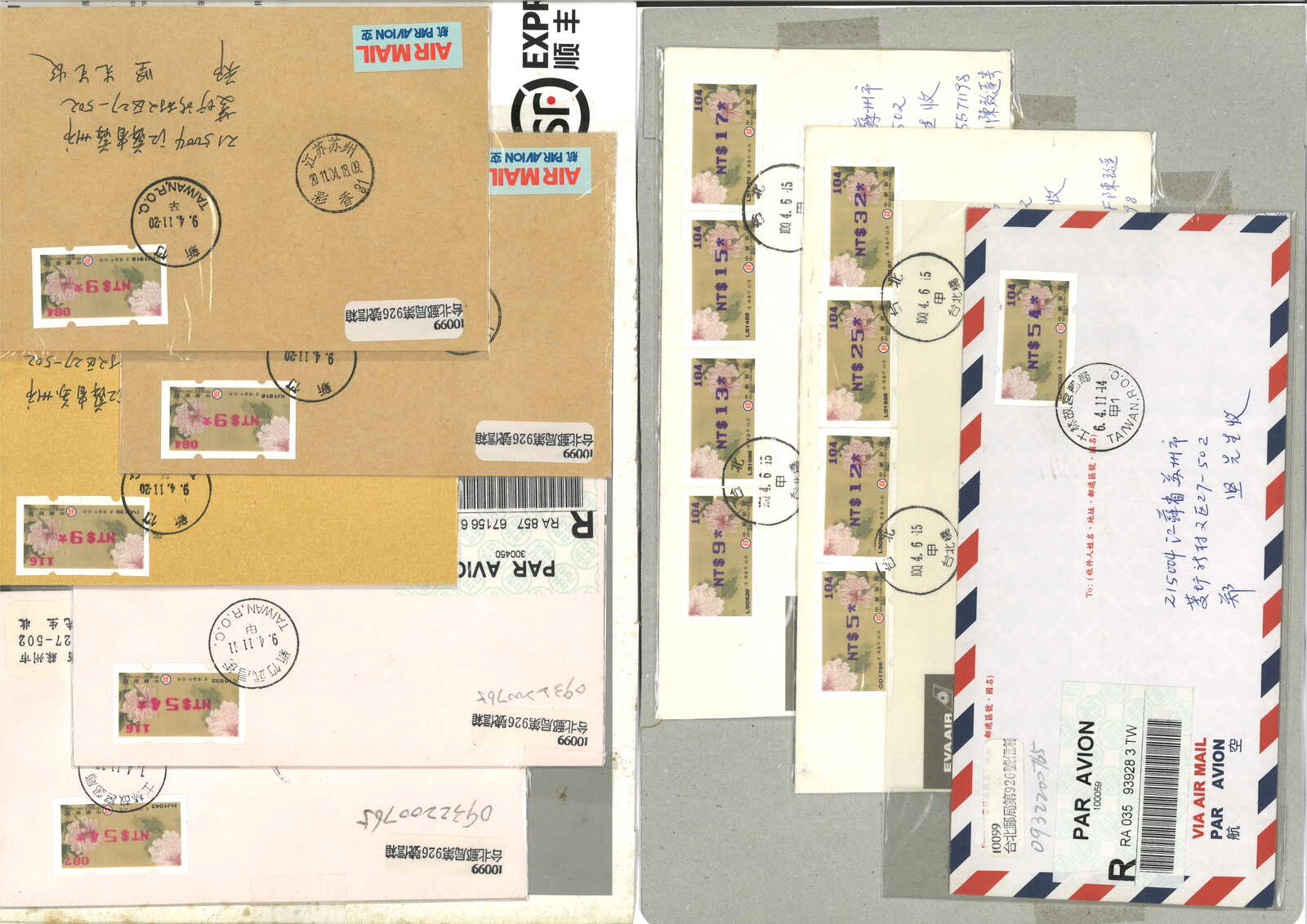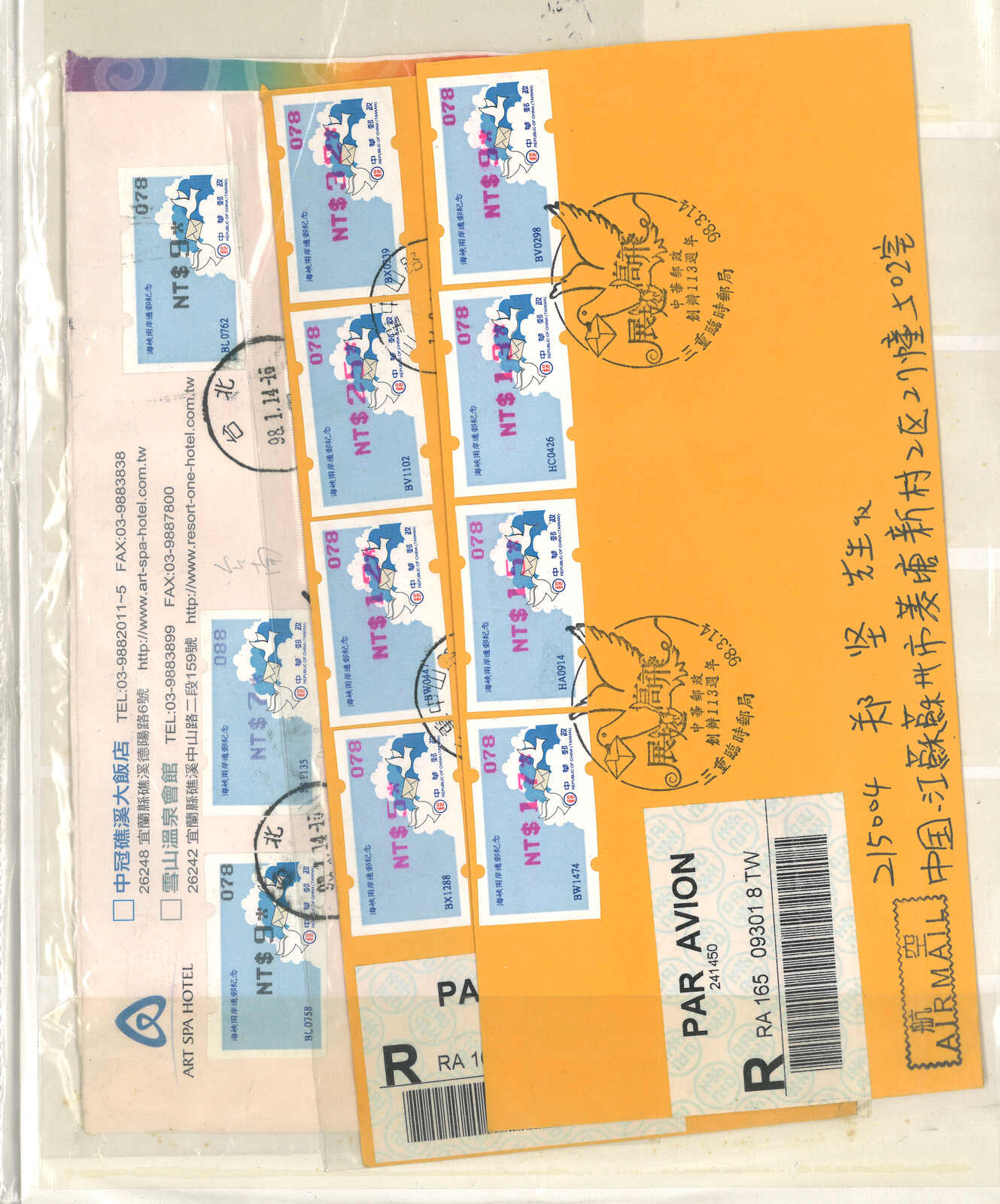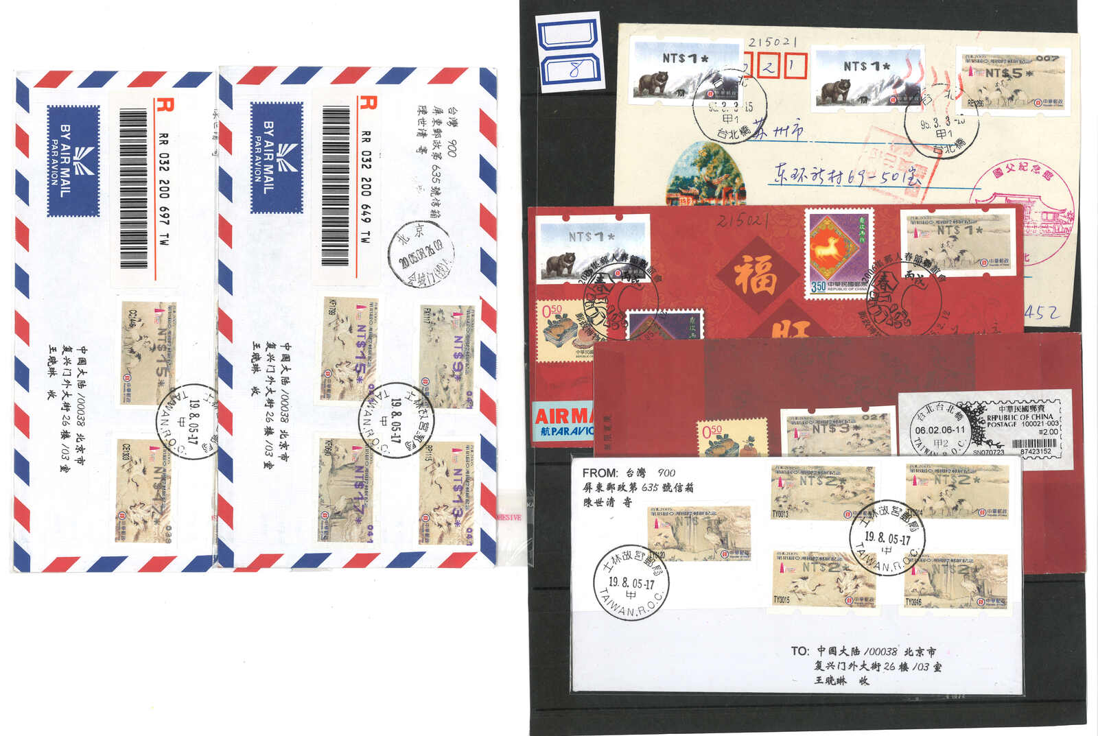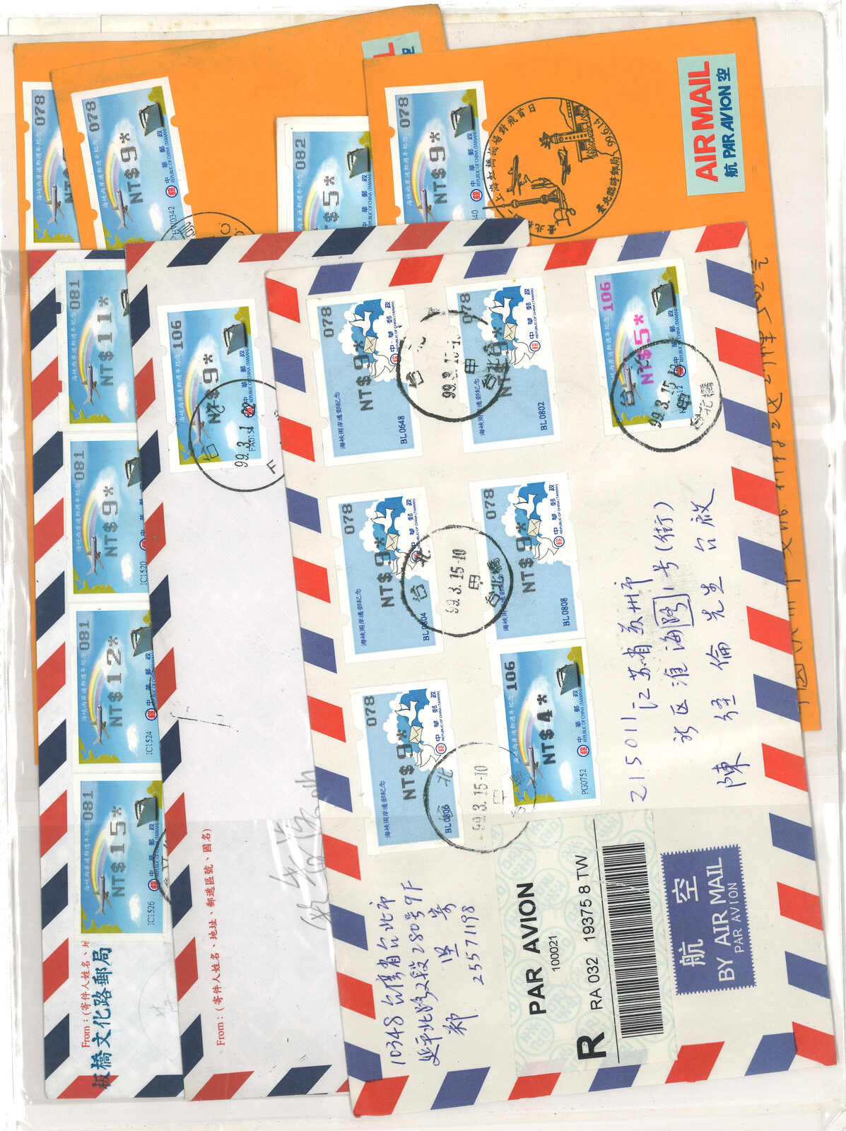 3429 cover image2008 a comprehensive collection of Taiwan Cross-strait Direct Mail Service ATM stamps, containing about 110 stamps and 110 covers, including complete set from all vending marchines, scarce GQ369 stamp, variety stamps, commemotive covers, airplane picture postcards etc. Please view.