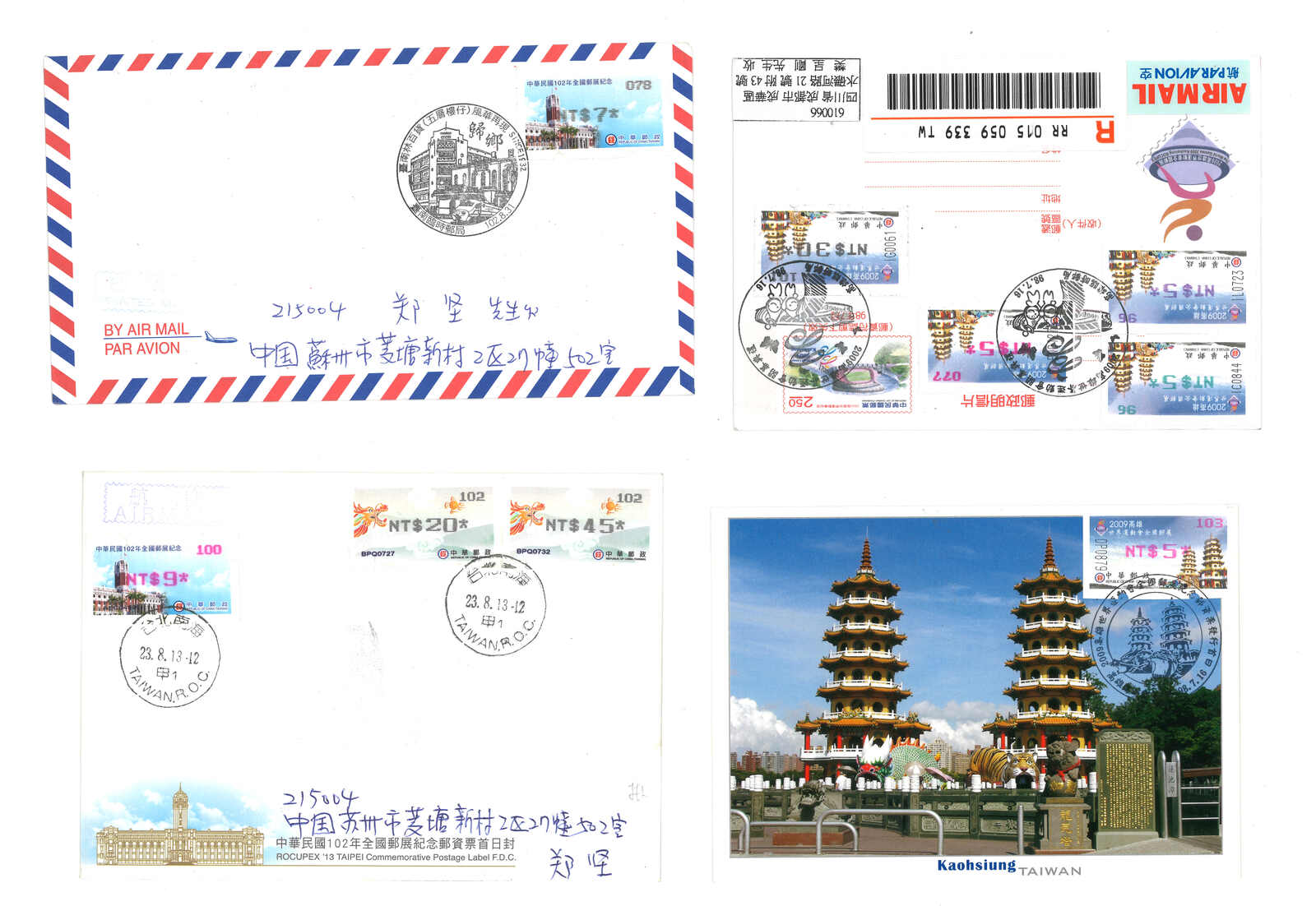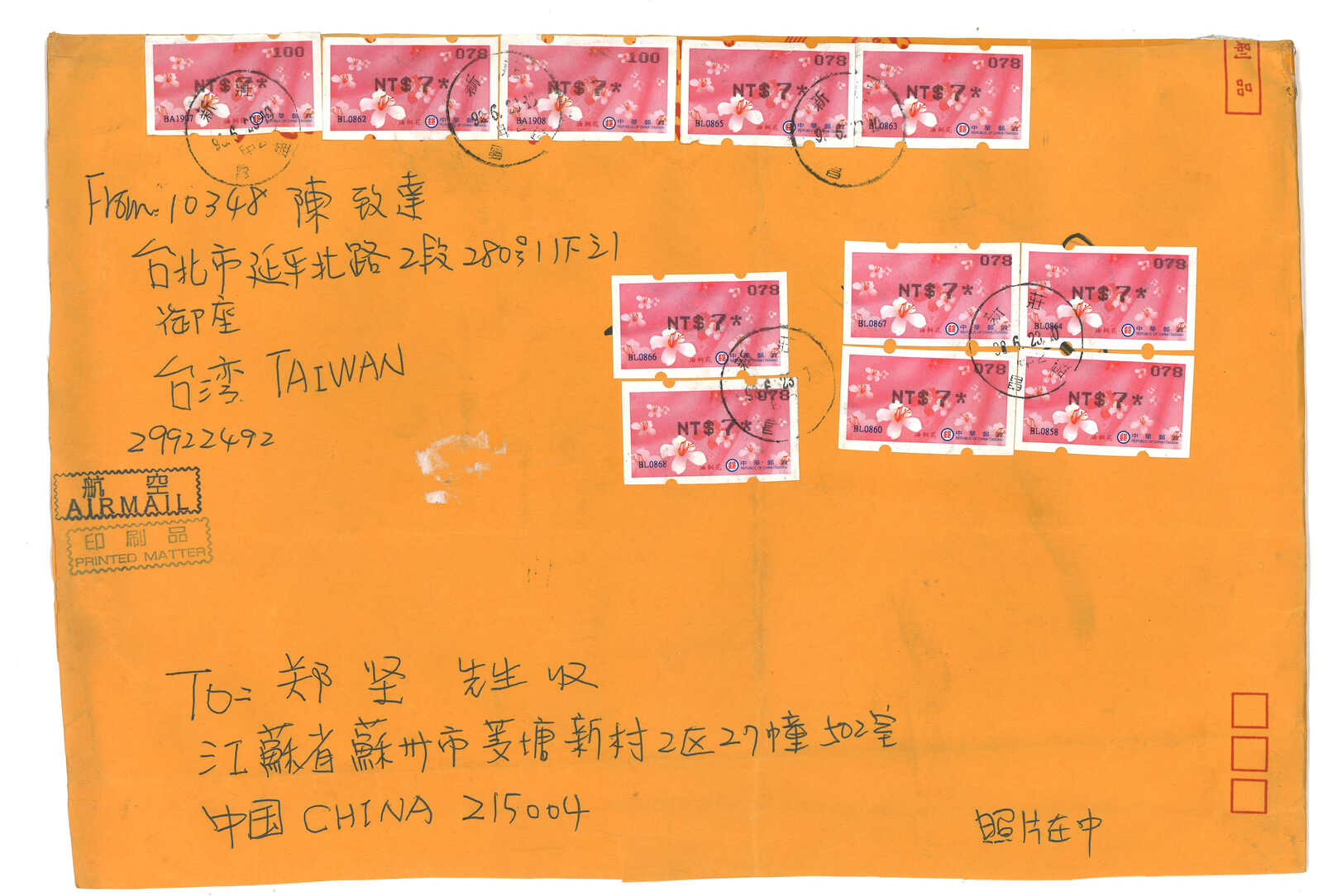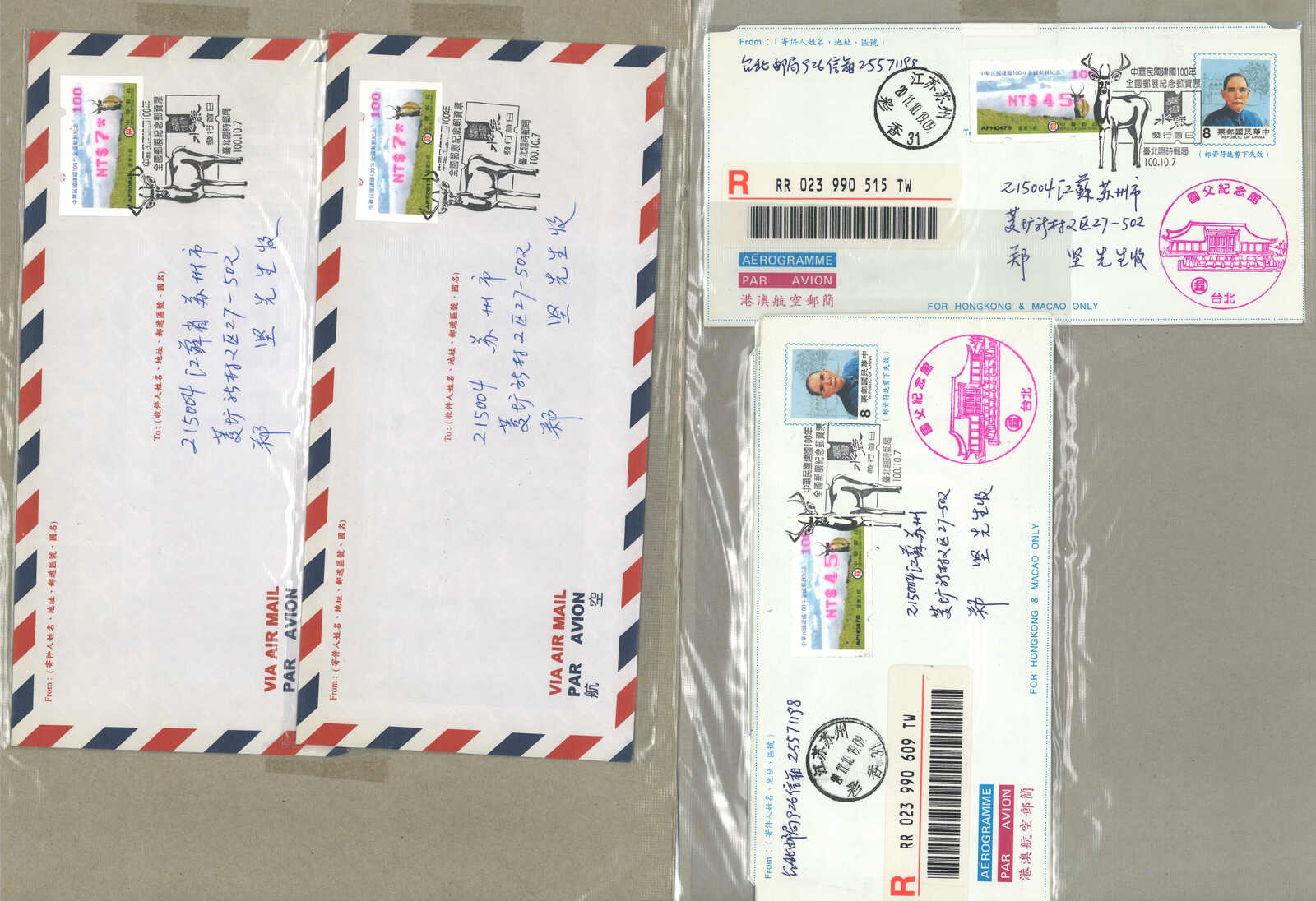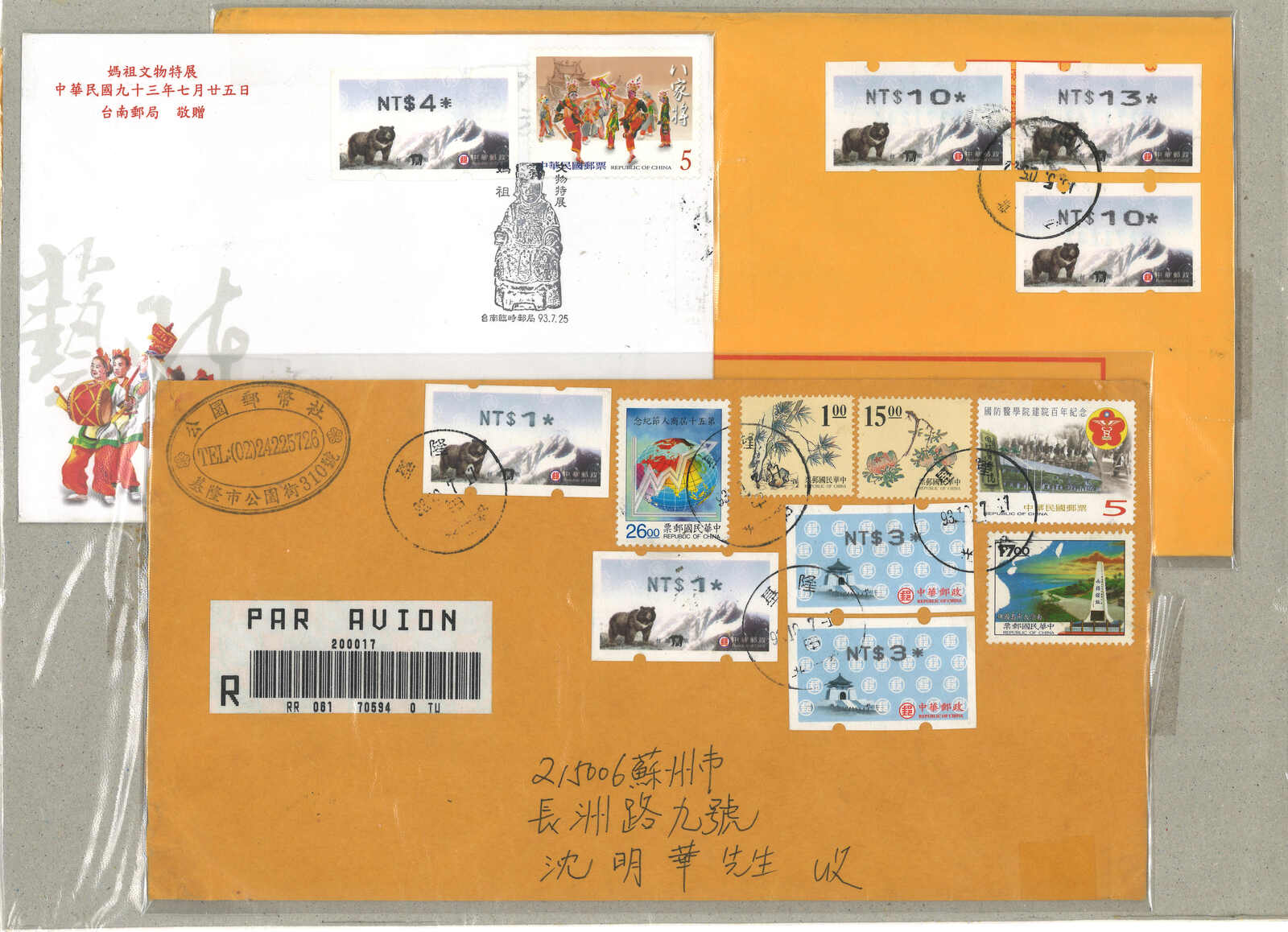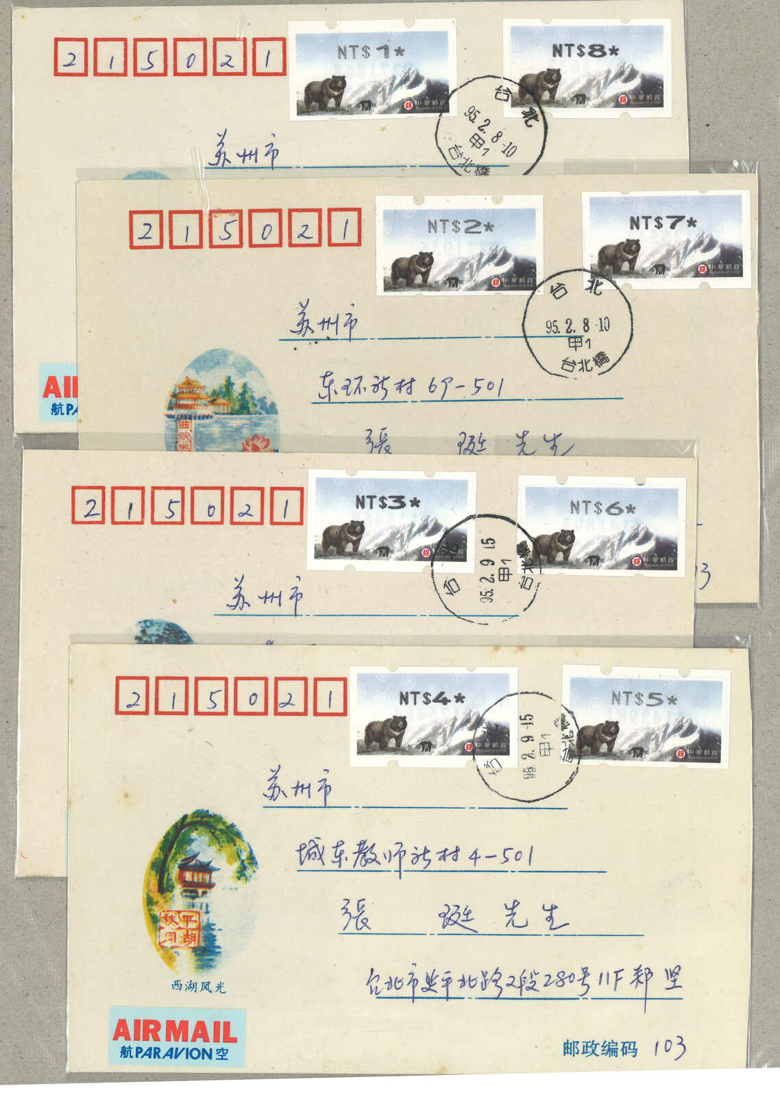 3429 cover image2008 a comprehensive collection of Taiwan Cross-strait Direct Mail Service ATM stamps, containing about 110 stamps and 110 covers, including complete set from all vending marchines, scarce GQ369 stamp, variety stamps, commemotive covers, airplane picture postcards etc. Please view.