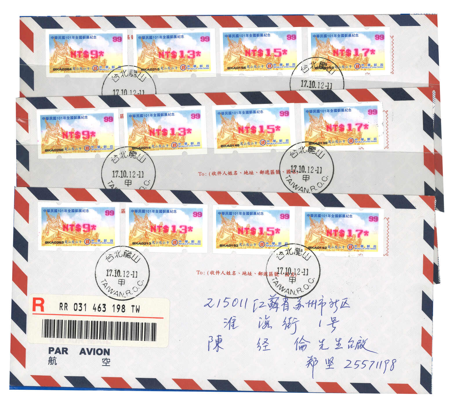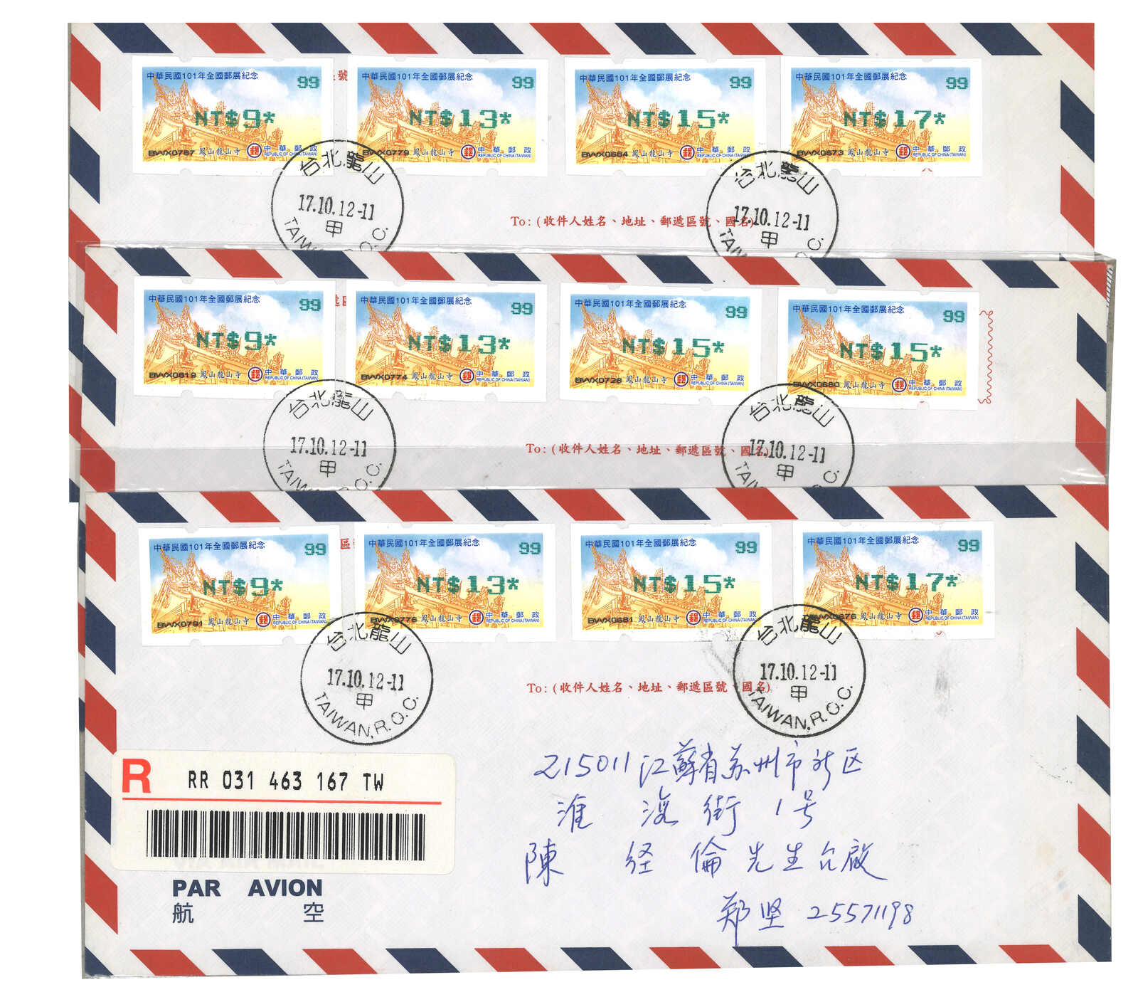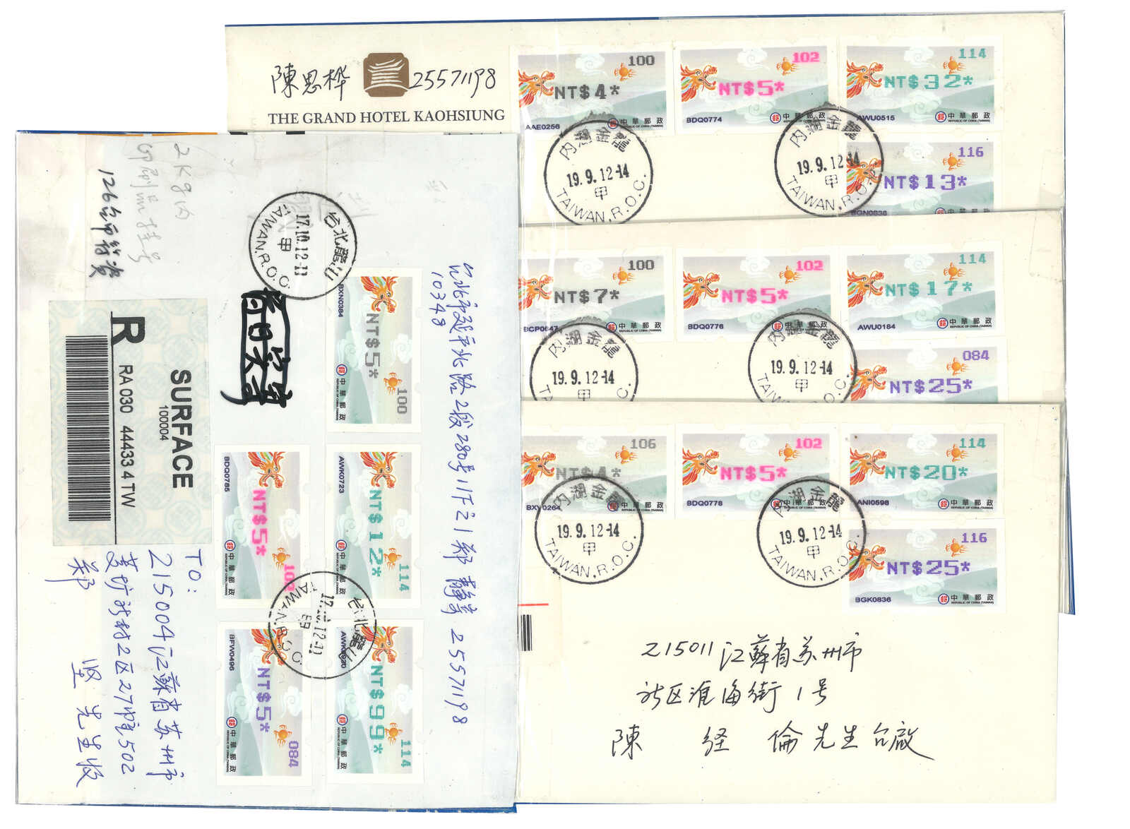 3437 cover image2012 a comprehensive collection of Taiwan ROCUPEX 12 Fongshan ATM stamps, containing about 20 stamps and 40 covers, including mint stamps, combination covers and commerically used covers. rs etc.