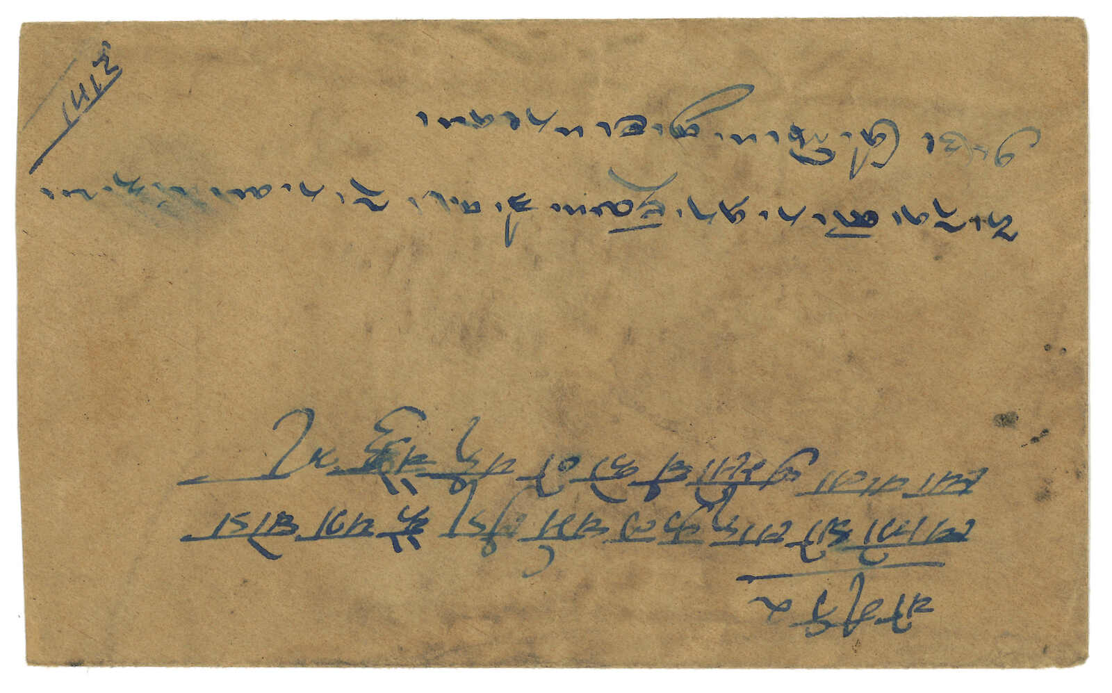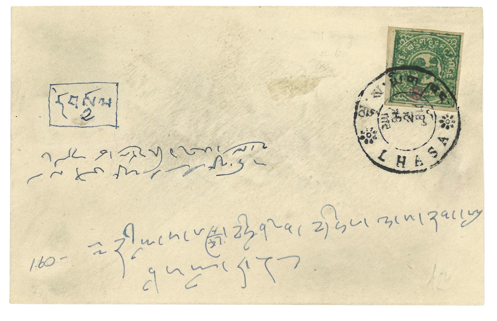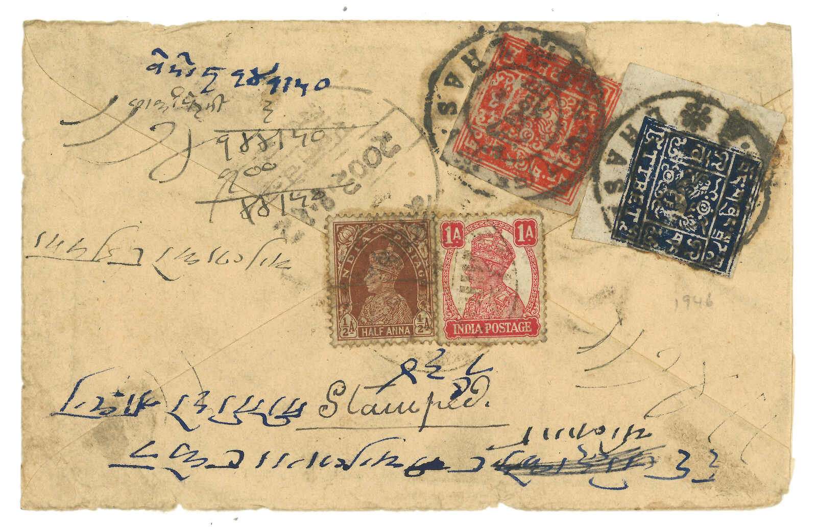 拉薩寄尼泊爾混貼票,貼西藏獅圖第三版2/3章噶,銷拉薩 戳記。加貼印度佐治五世半安娜 + 1安娜。抵尼泊爾。(Image 1)