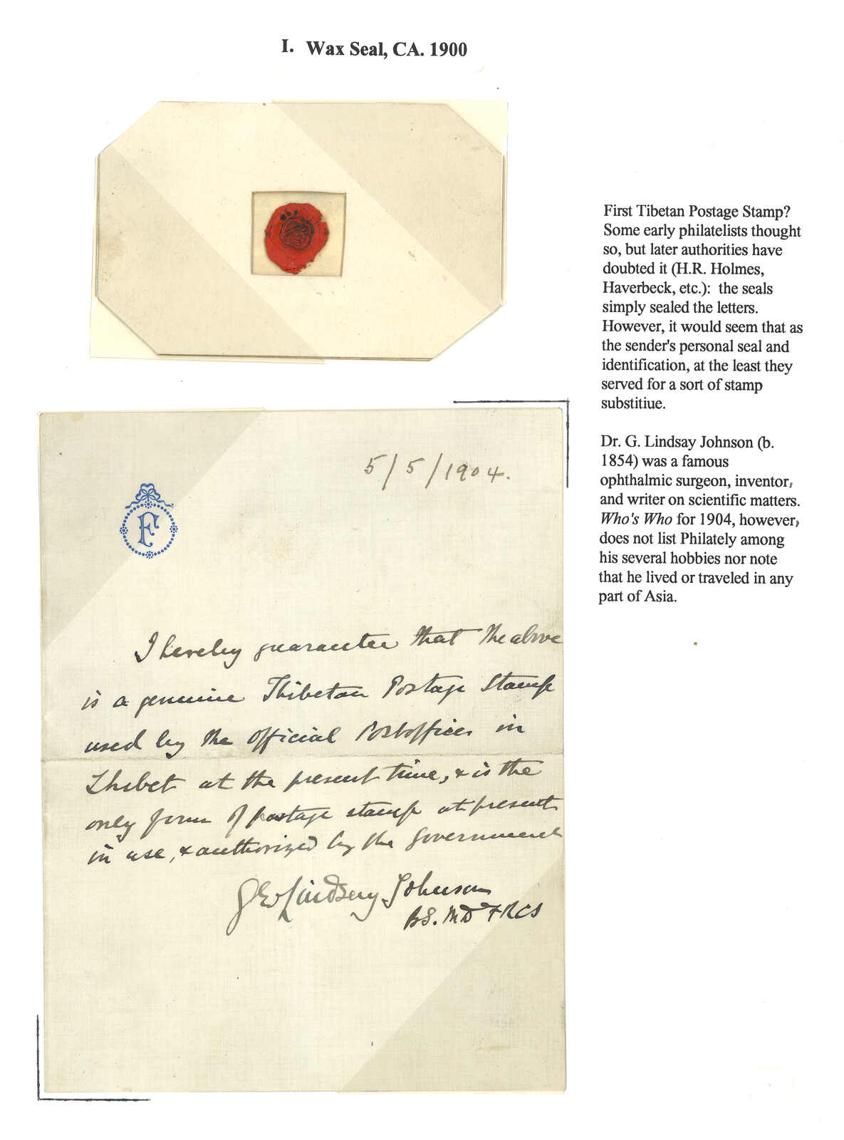 1904.5.5 G. Lindsay Johnson醫生信件及火漆剪片一件。在信中, Johnson聲稱該火漆為西藏的郵票,但這種說法受到質疑。(Image 1)