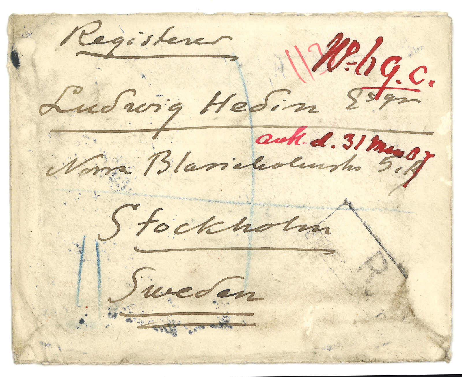 1907 Gyangtse (25 Feb) to Ludwig Hedin, father of Sven Hedin, Sweden. Registered cover, f.w. Indian KEVII 1a + 4a, tied by Gyantse BPO cds, matching with registered mark. Arrived Stockholm (31 Mar).