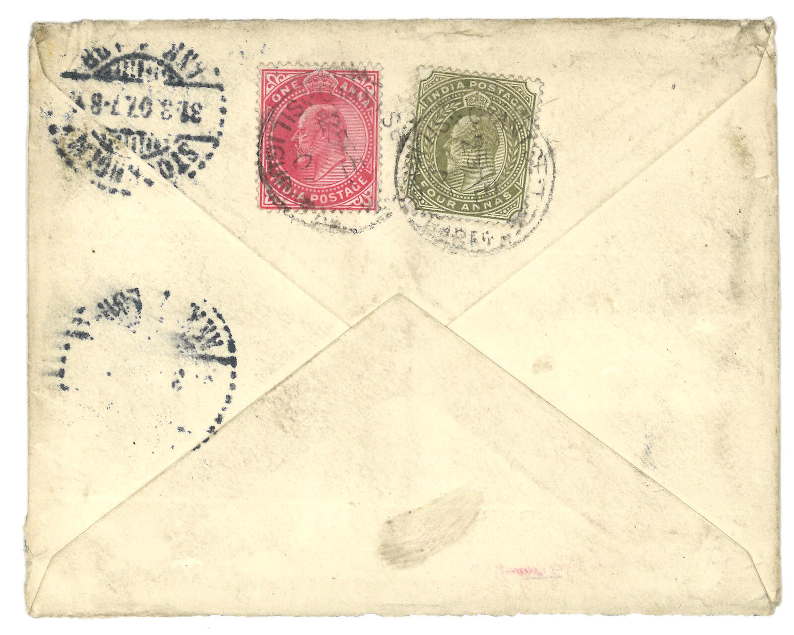 江孜寄瑞典斯文赫定之父親Ludwig Hedin。掛號封,貼印度愛德 華七世1安娜 + 4安娜,銷江孜英局日戳,另鈐掛號章。3.31抵斯德哥爾摩。(Image 1)