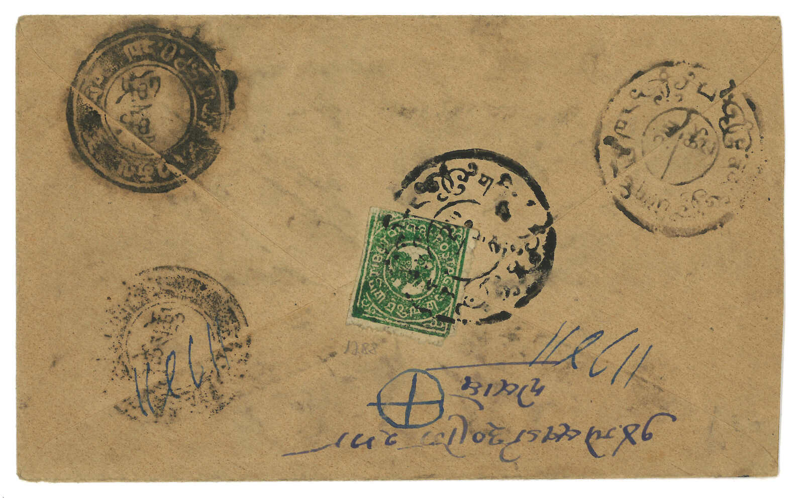 1912 Shigatse to Lhasa, f.w. Tibet 1st issue perforated 1/6tr on reverse, tied by Shigatse type 1 h.s. Transit Gyantse, Penam, Pelti with respectively h.s. Some specialists suggested that the perforated stamps were used by the
