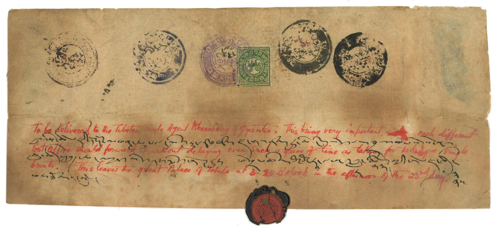 1904 (5 May) a letter from Dr. G Lindsay Johnson and a wax seal on piece. In the letter, Dr. Johnson claimed that the wax seal is a Tibetan postage stamp used by the official post office. Still, opinions vary on Dr. Johnson’s