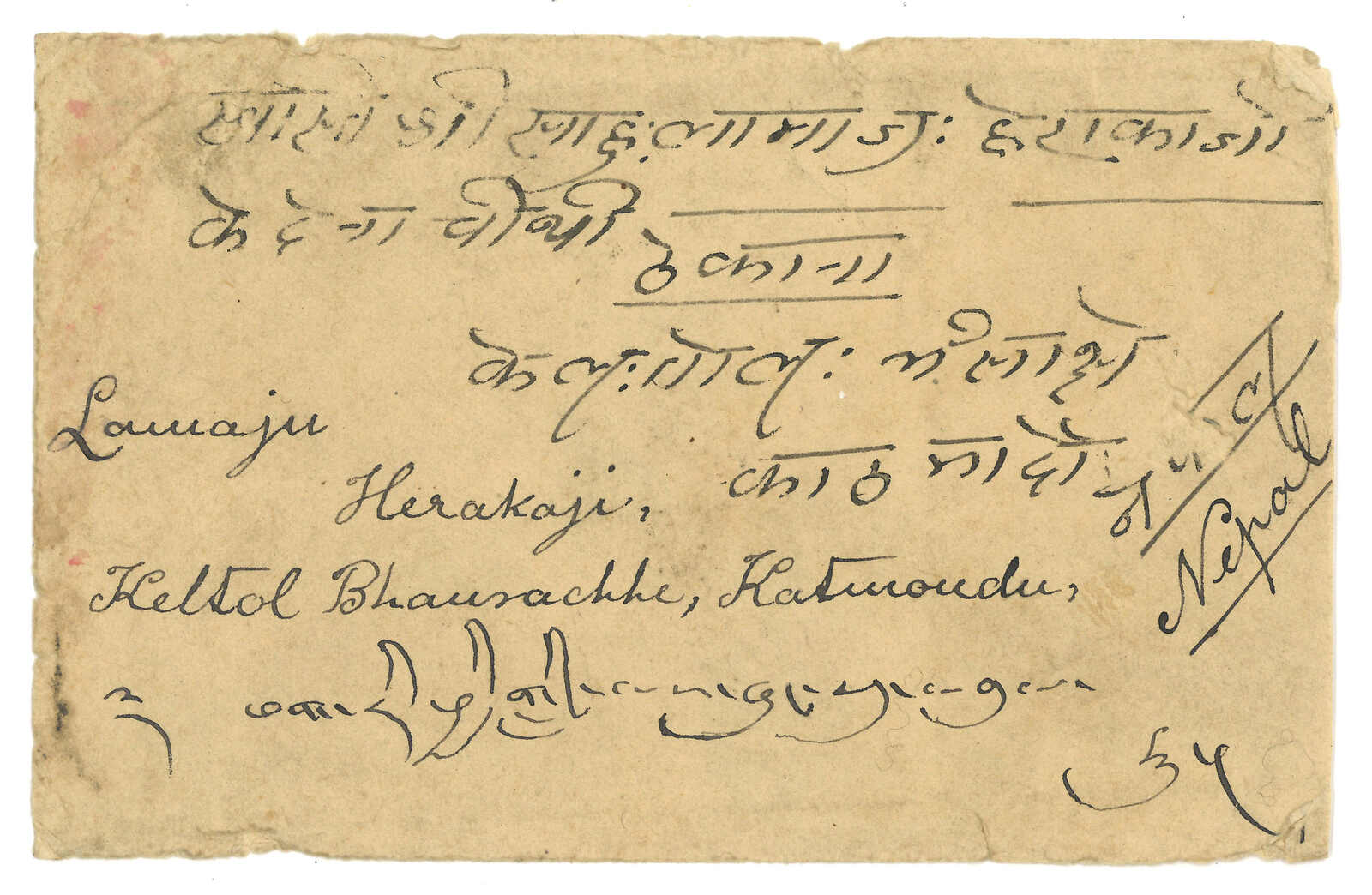 Combination cover from Lhasa to Nepal, f.w. Tibet 3rd issue 2/3tr + 2tr, tied by Lhasa h.s. In combination with Indian KGV 1/2a + 1a. Arrived Nepal.