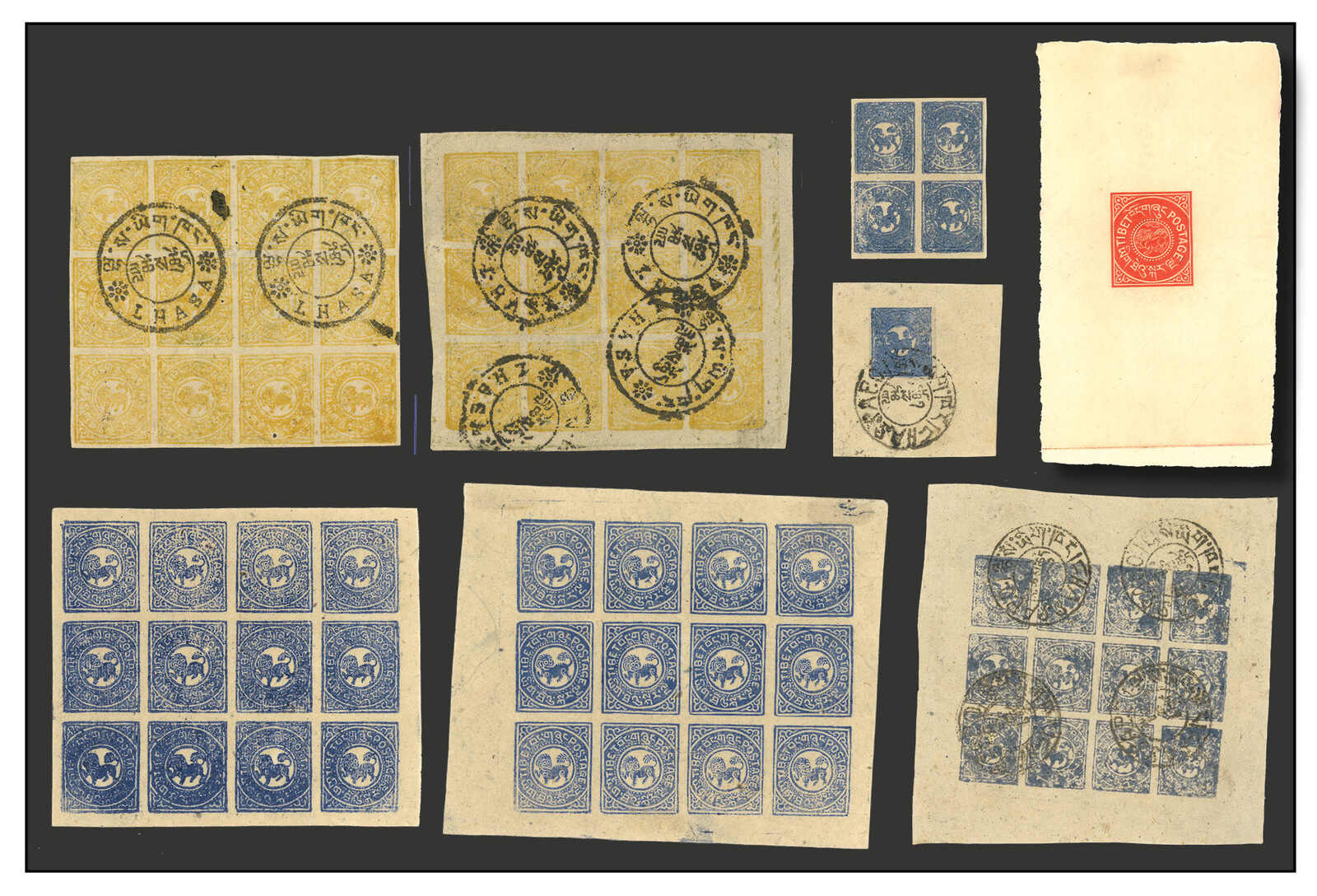 1912年一組西藏獅圖第一版郵票集藏,包含華德路樣票、1/3章噶全張數件、黃色1/2章噶及1章噶全張。當中1/3章噶