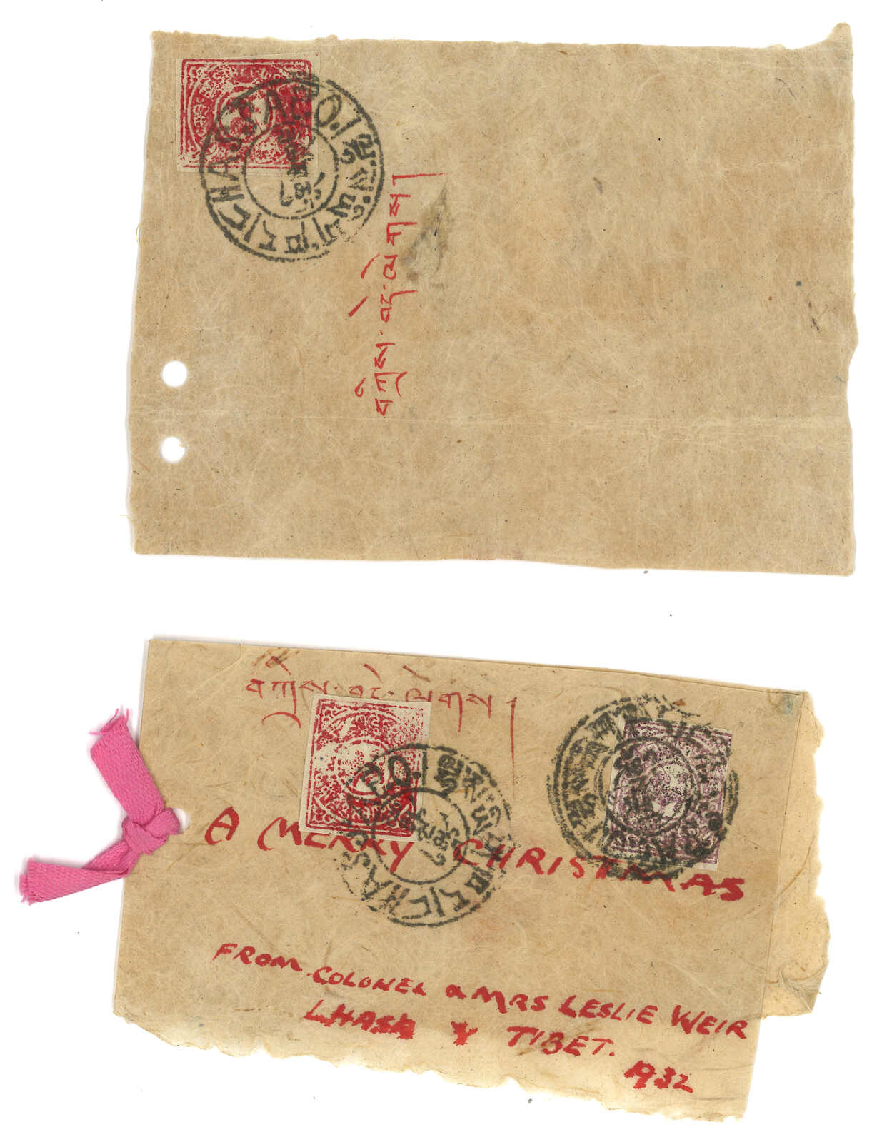A Christmas card piece from Colonel Leslie Weir, Lhasa, f.w. Tibet 1st issue x2, tied by Lhasa h.s., alongside with another Lhasa cover piece
