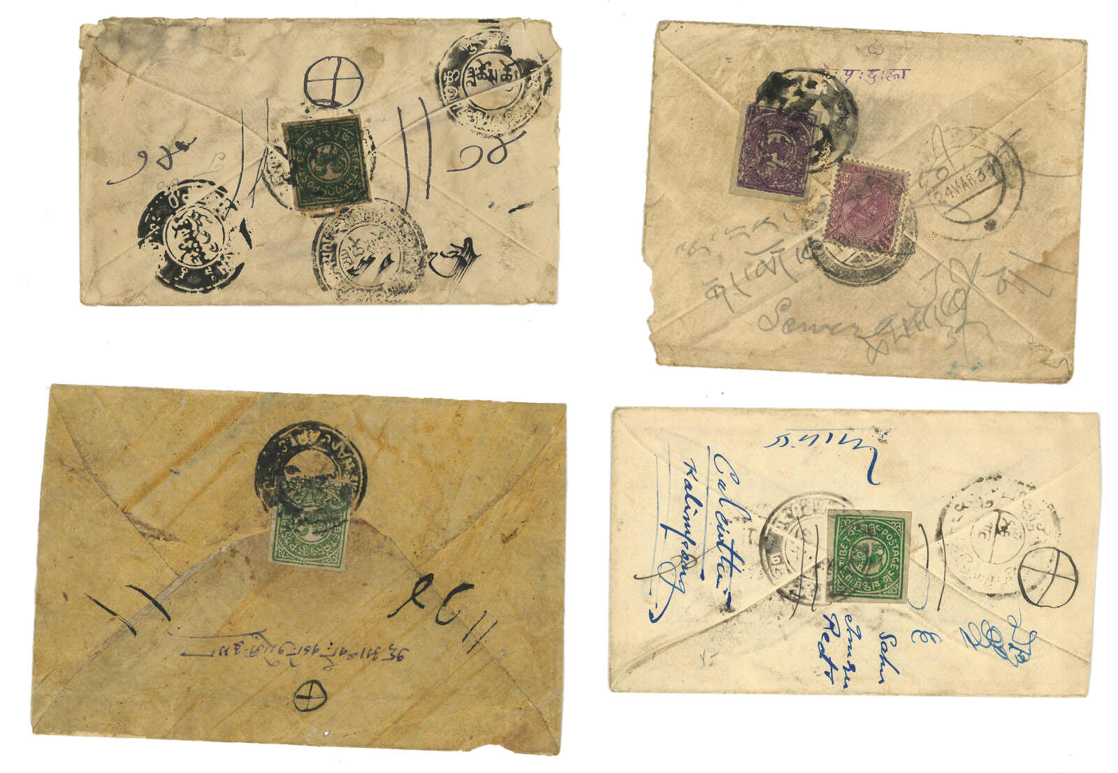 1910至1930年代一組約21件貼用西藏獅圖第一版之信封,展示了不同郵資、曲水、白地等稀罕郵戳,有光墨之貼票等。請預覽。(Image 1)