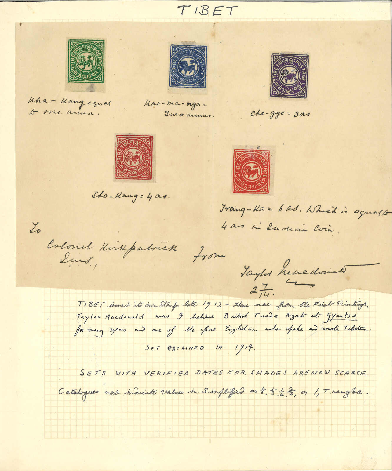 1914 Presentation sheet of Tibet 1st issue, showcasing 1st printing of 1/6tr, 1/3tr, 1/2tr, 2/3tr and 1tr stamp. With annotation of Taylor MacDonald who probably was the British Trade Agent at Gyantse. Historical.
